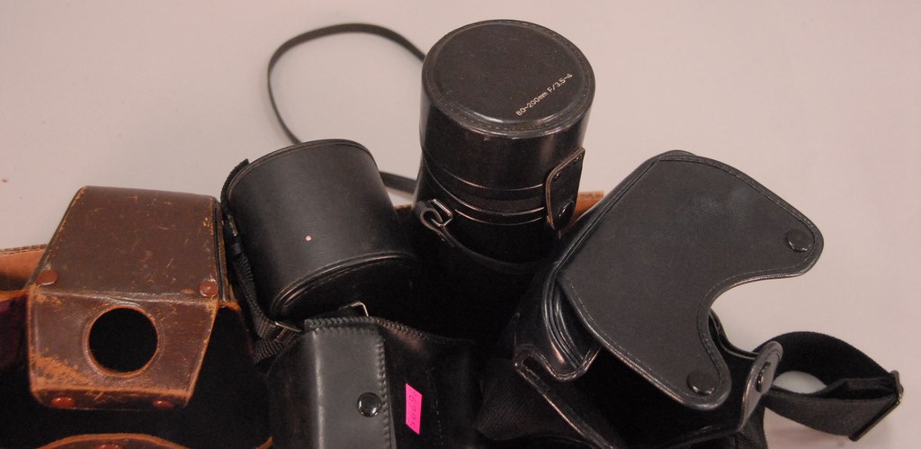 Two vintage Nikon F cameras Nippon Kogaku Tokyo with 50 mm lens and a Minolta 7000 with lenses.