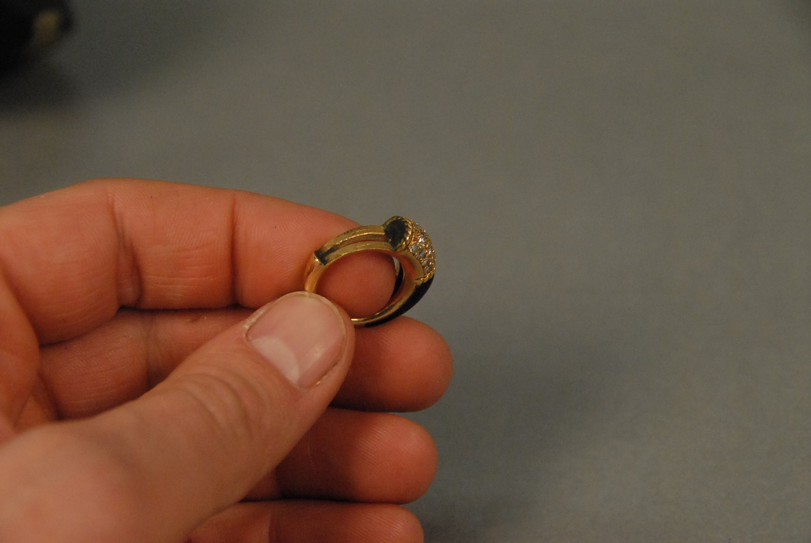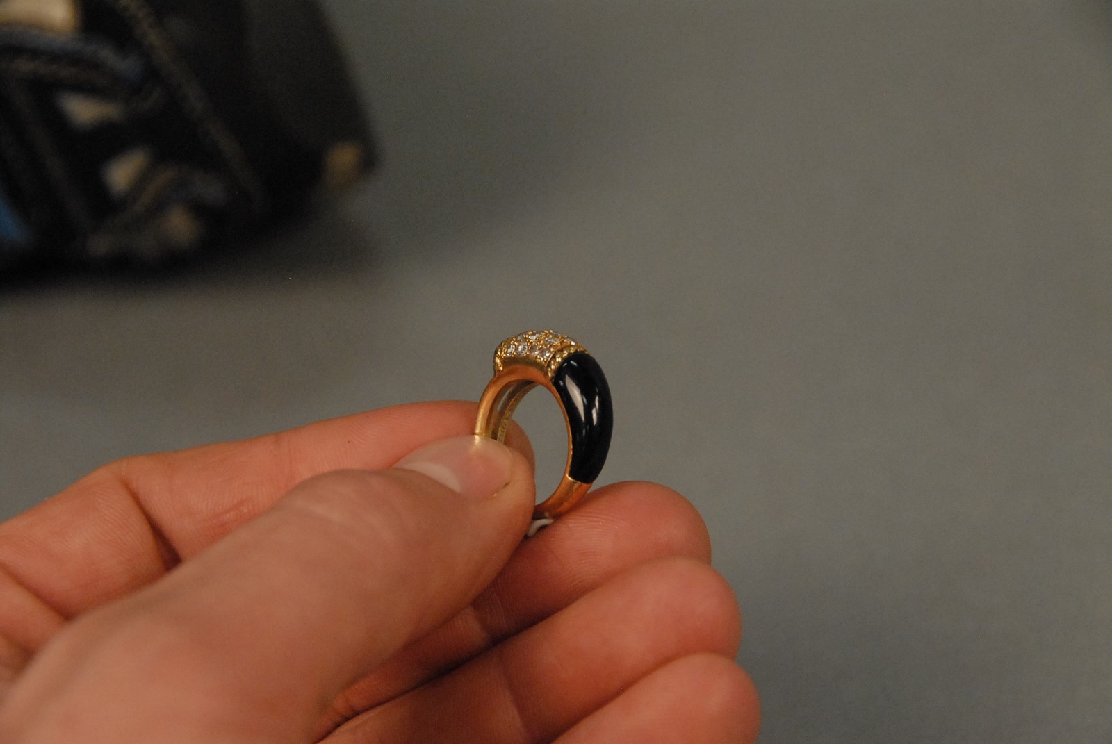Lot 70: Van Cleef & Arpels 18K gold ring set with black onyx and diamonds one side of black onyx missing 101372. 6.6 grams