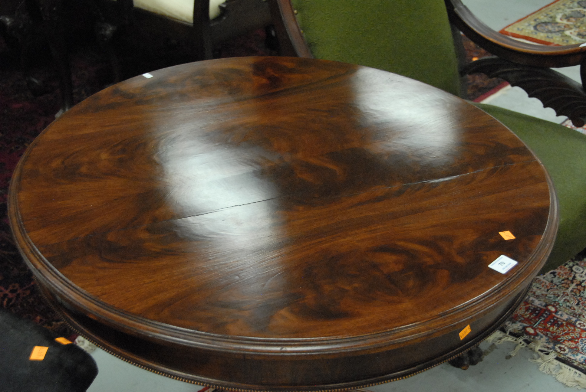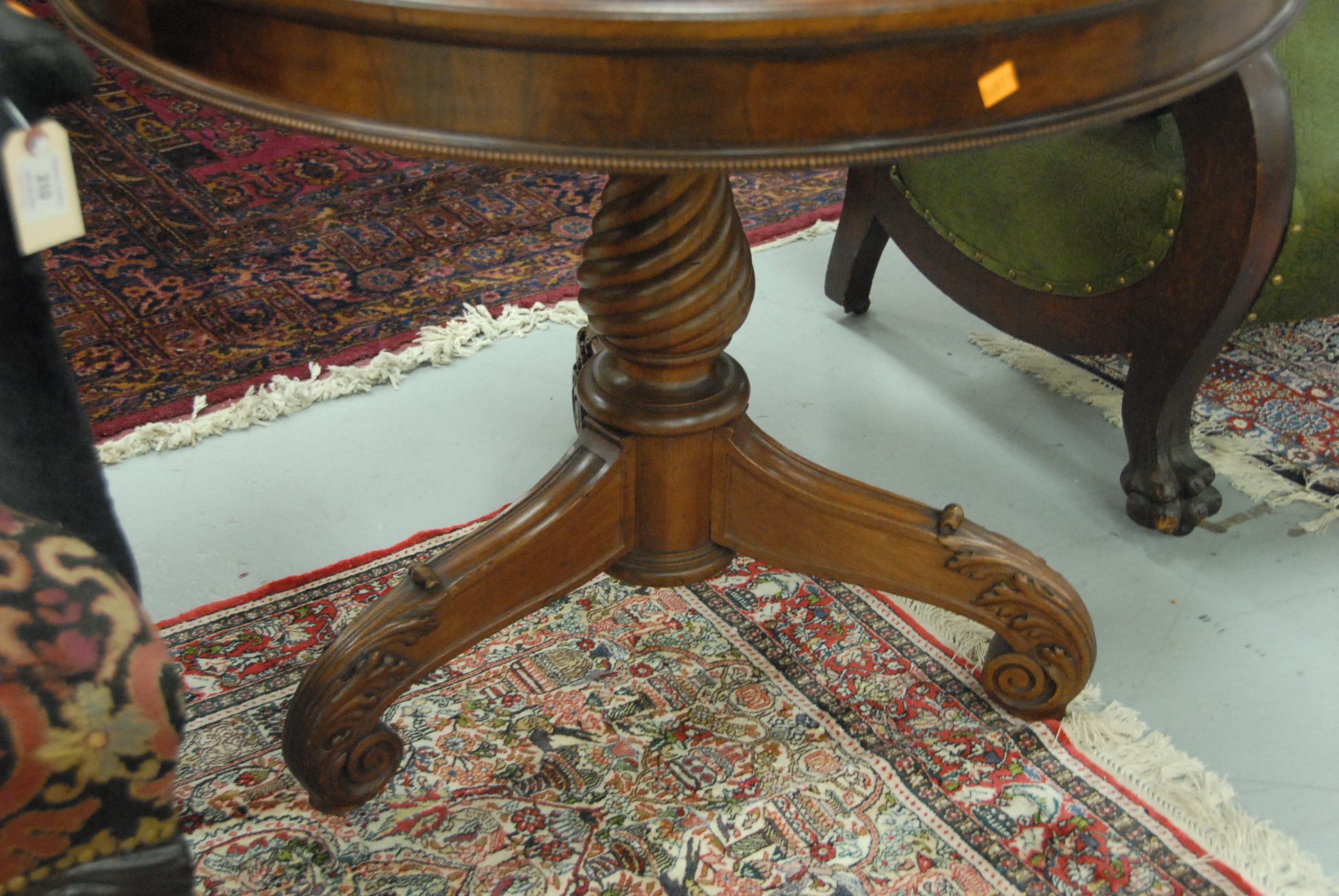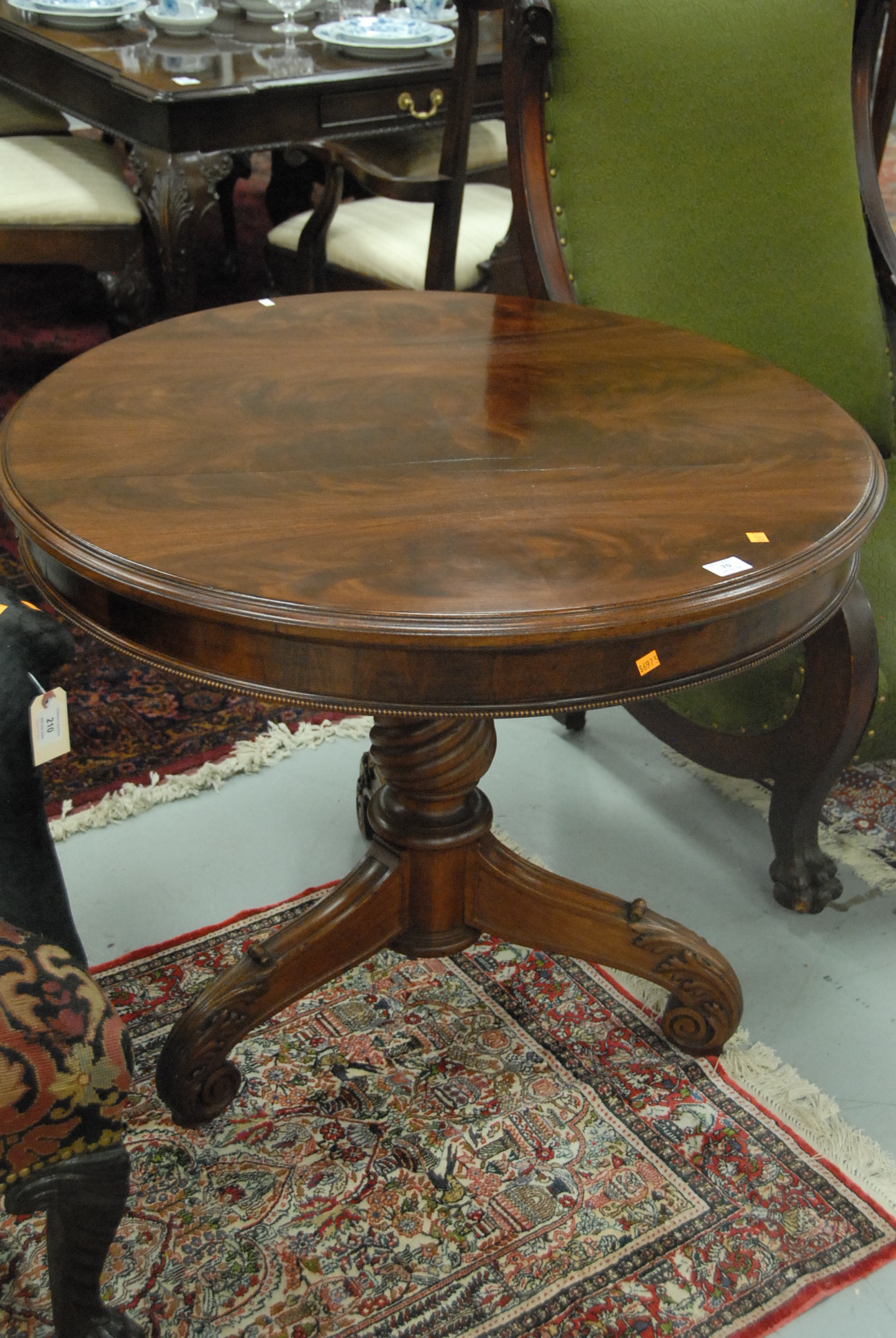 Victorian mahogany round center table with scroll feet and turned shaft.