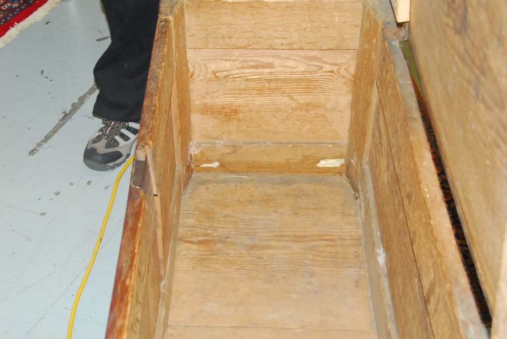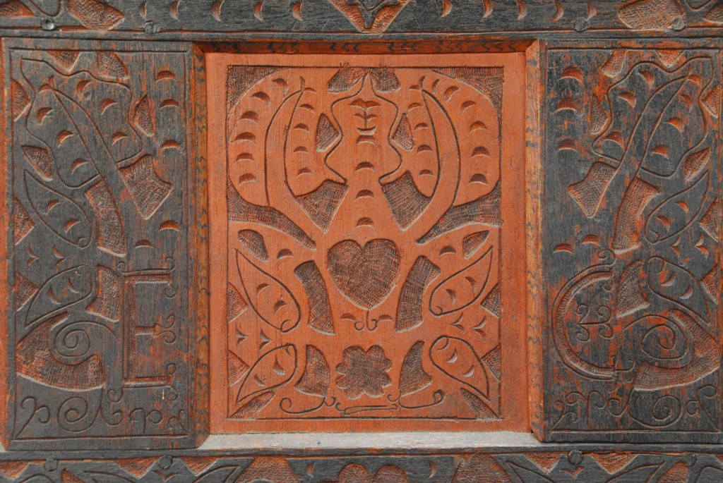 Hadley chest having three panel front each with heart and leaf design surrounded by carved leaves and flowers with plain recessed panel sides, front and sides probably original red and black paint, initialed EC lower drawer removed, ht. shortened. – ht. 25 1/2in. wd. 49in. dp. 20in.