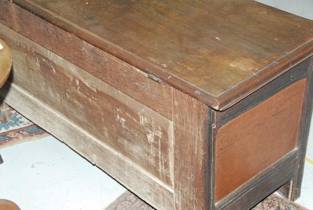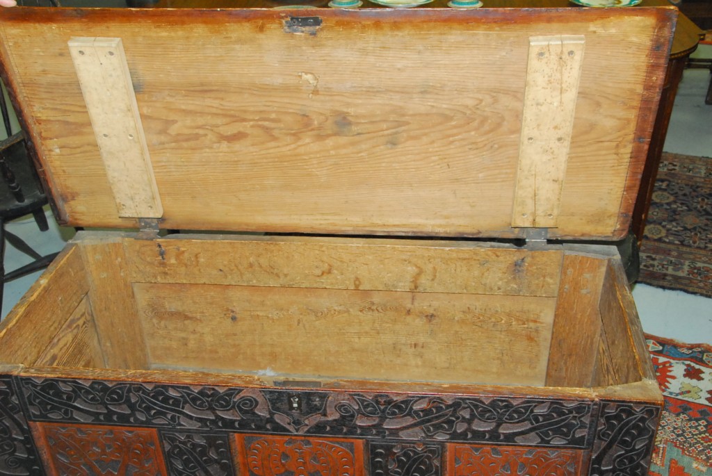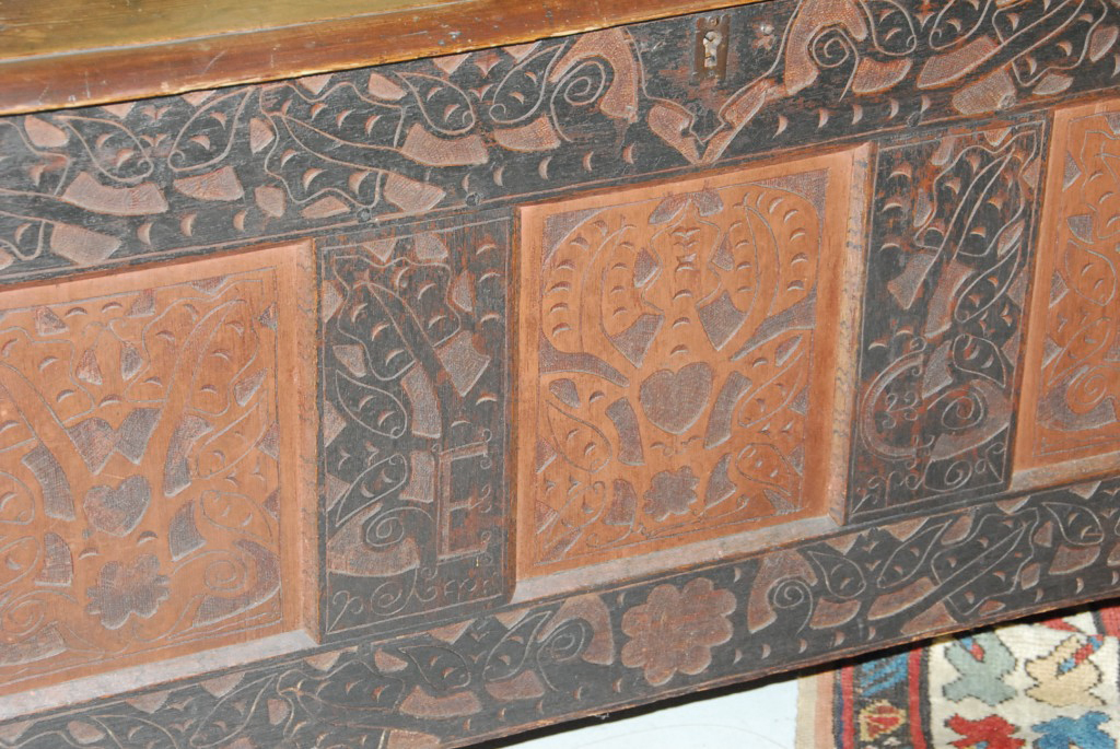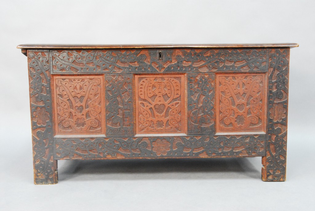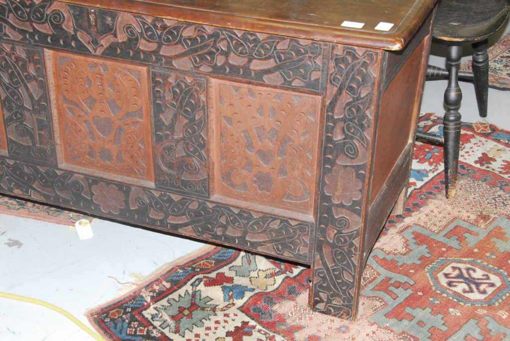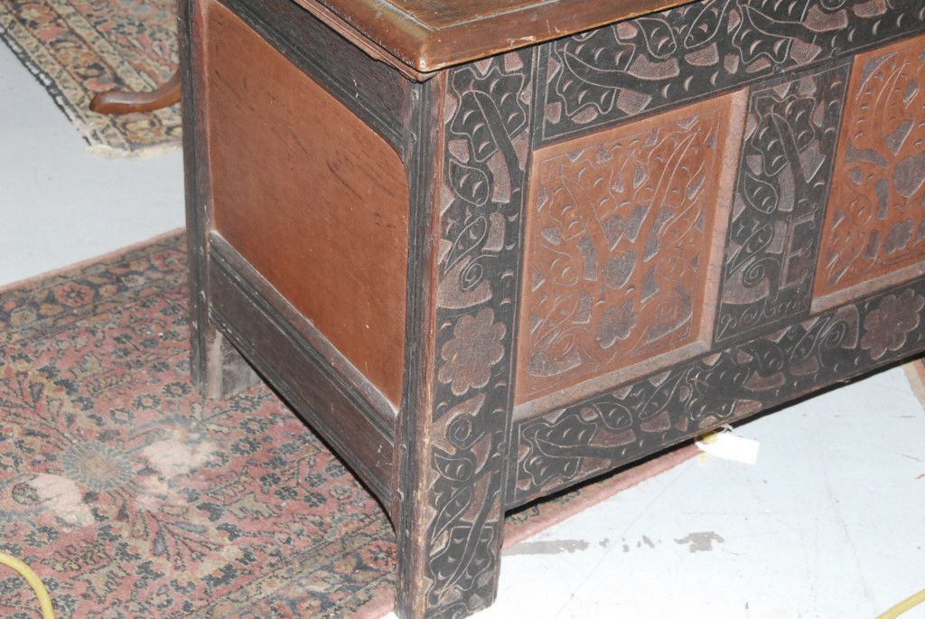 Lot 700: Hadley chest having three panel front each with heart and leaf design surrounded by carved leaves and flowers with plain recessed pa…
