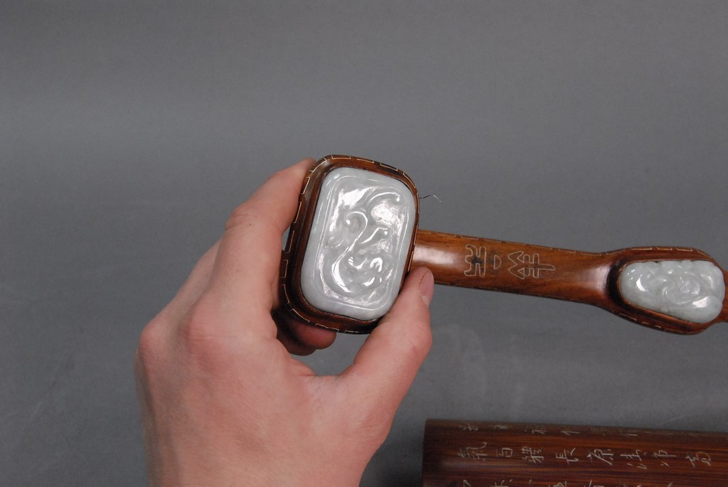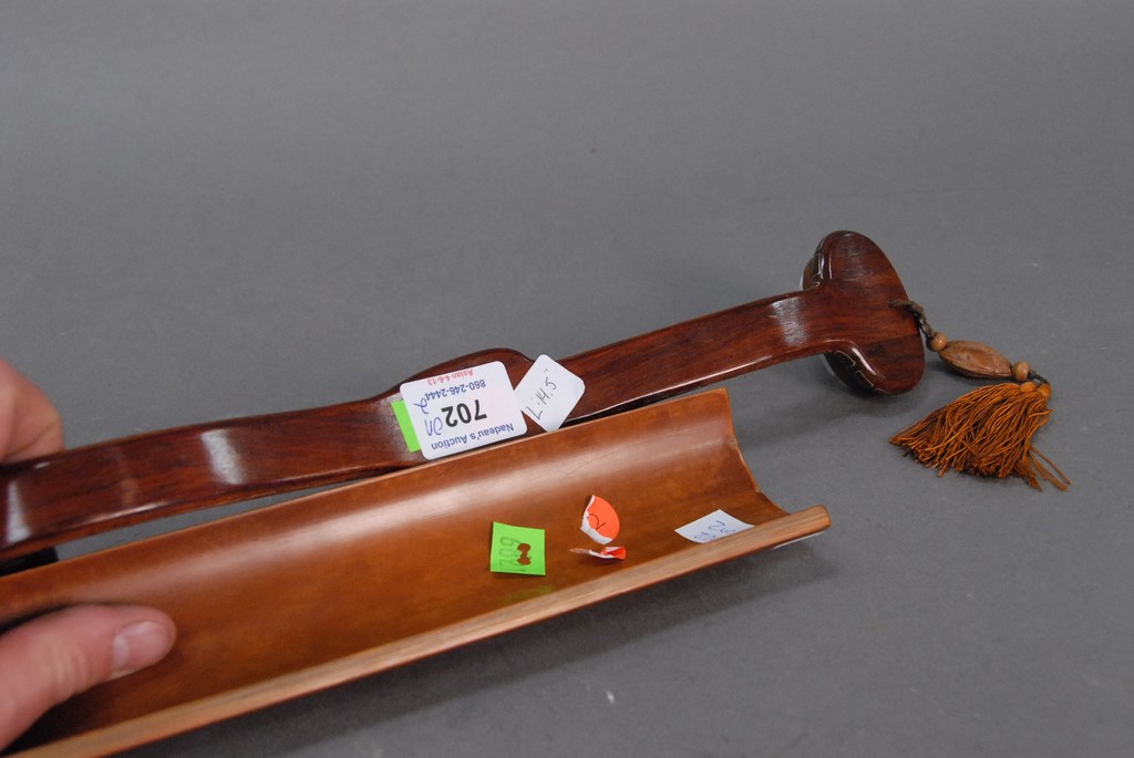Lot 702: Carved bamboo forearm rest and a quartz and hardwood ruyi scepter, inlaid with silver design. rest: lg. 9 1/2in. scepter: lg. 14 1/2in.