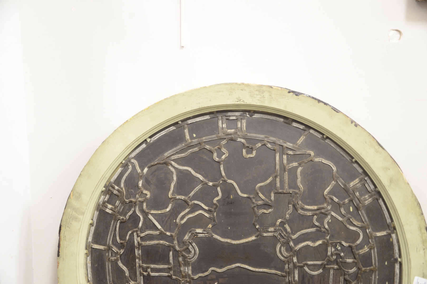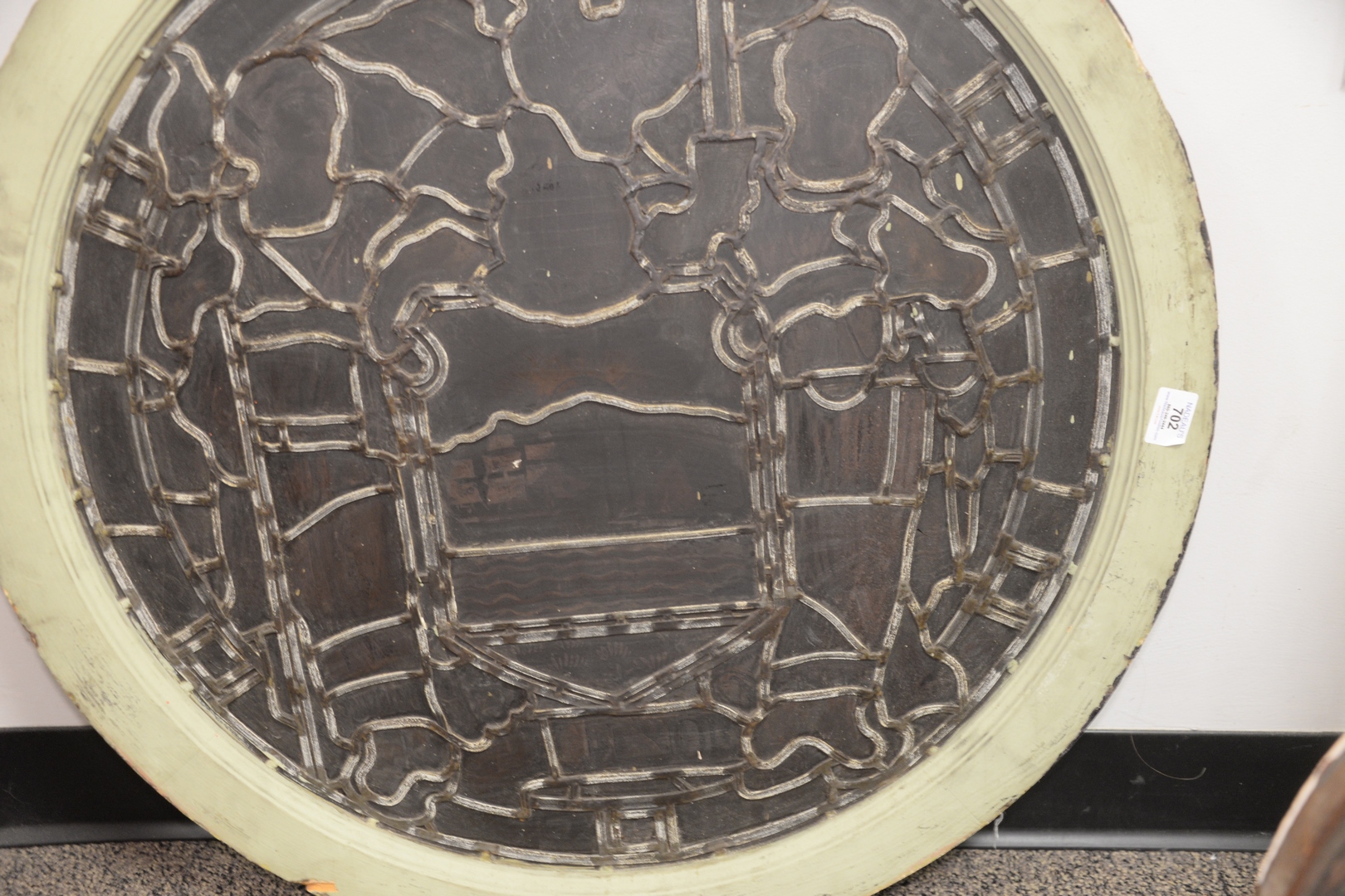 Lot 702: Round Stained and Leaded Window, marked ‘State of New York’ with ships, glass 28 inches, total 32 1/2 inches.