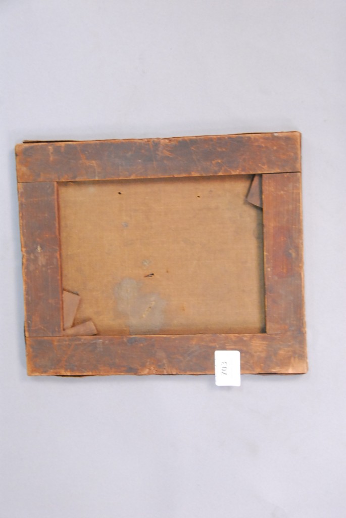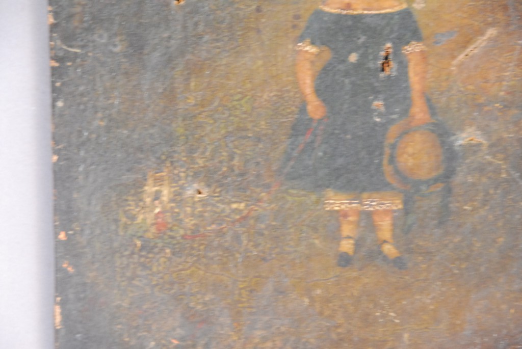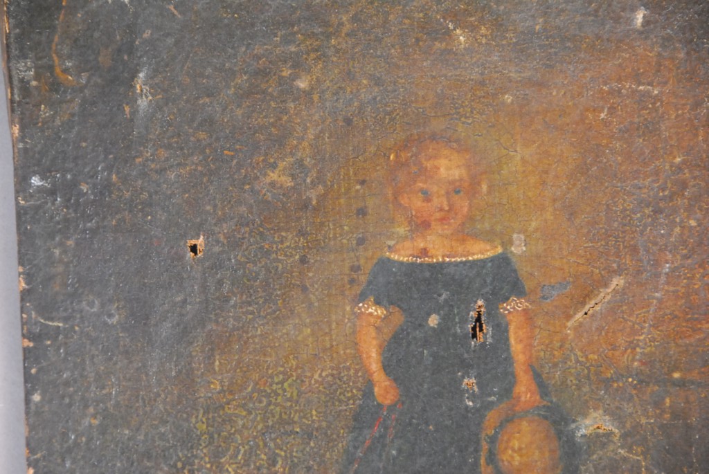 Lot 703: Primitive oil on canvas of a young girl in lace trimmed dress and straw hat with small pull toy in need of cleaning – small holes….