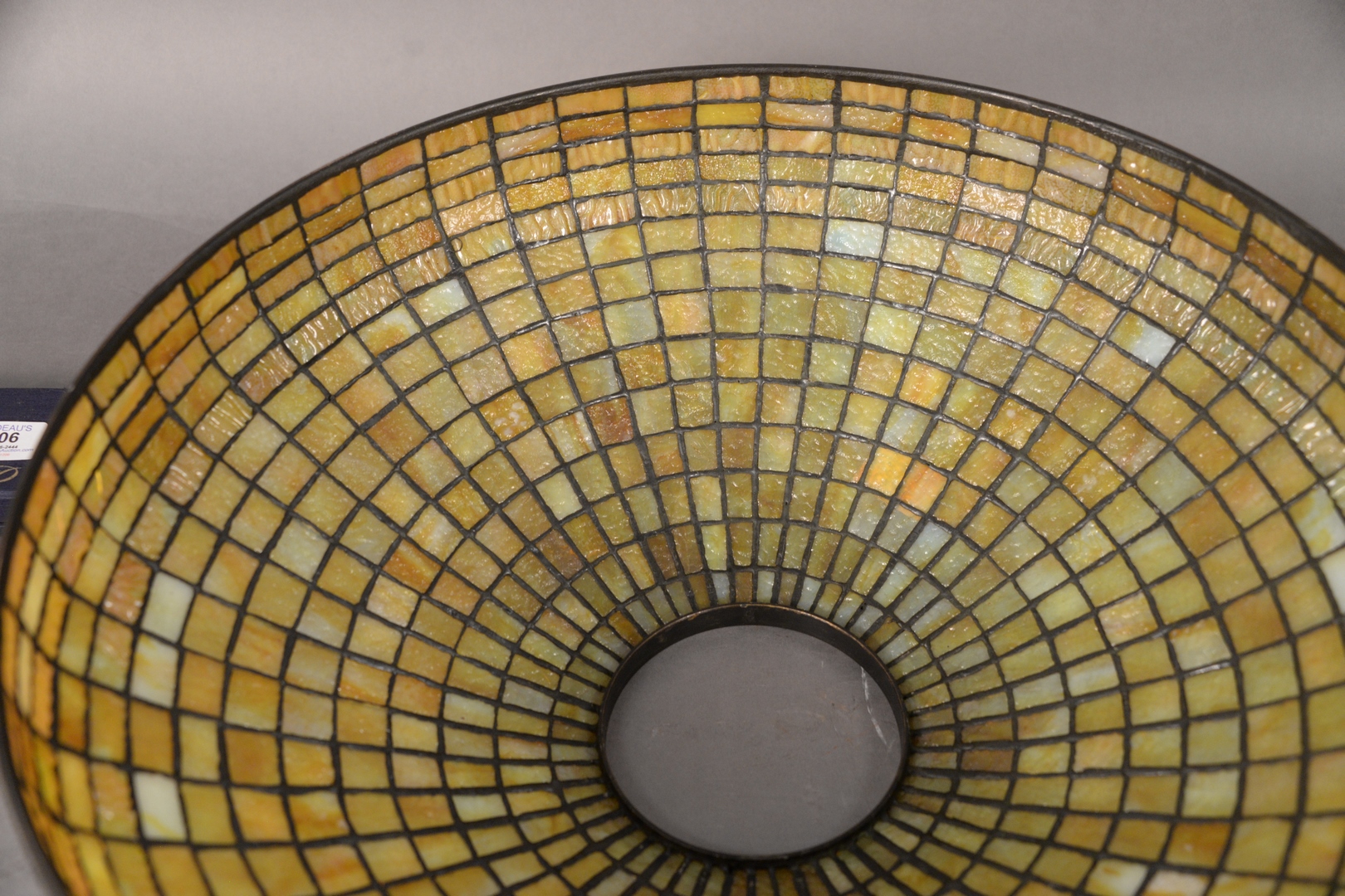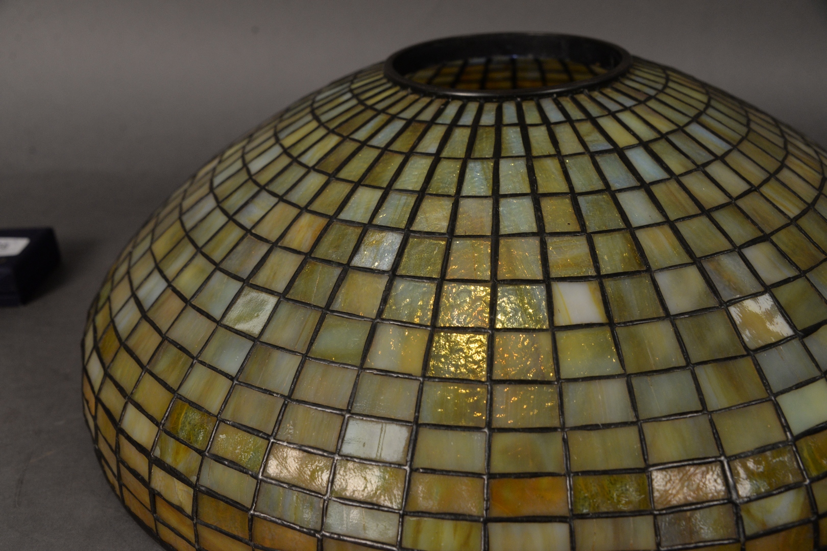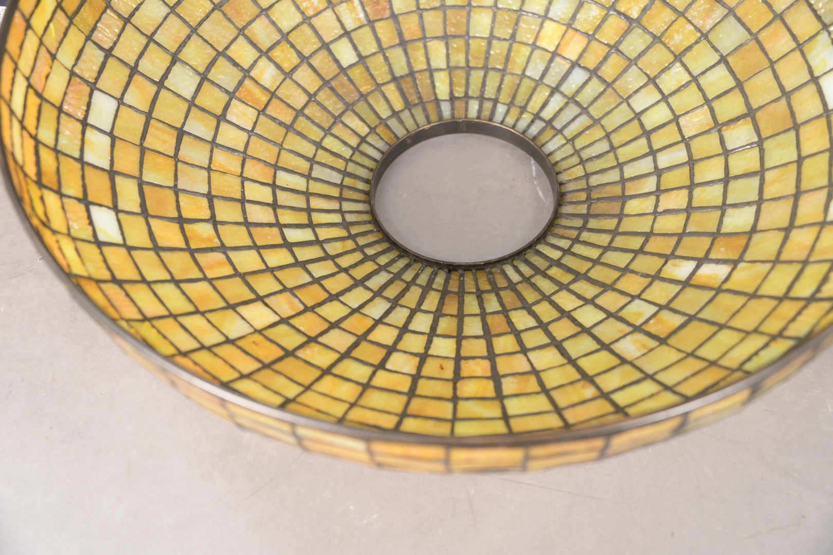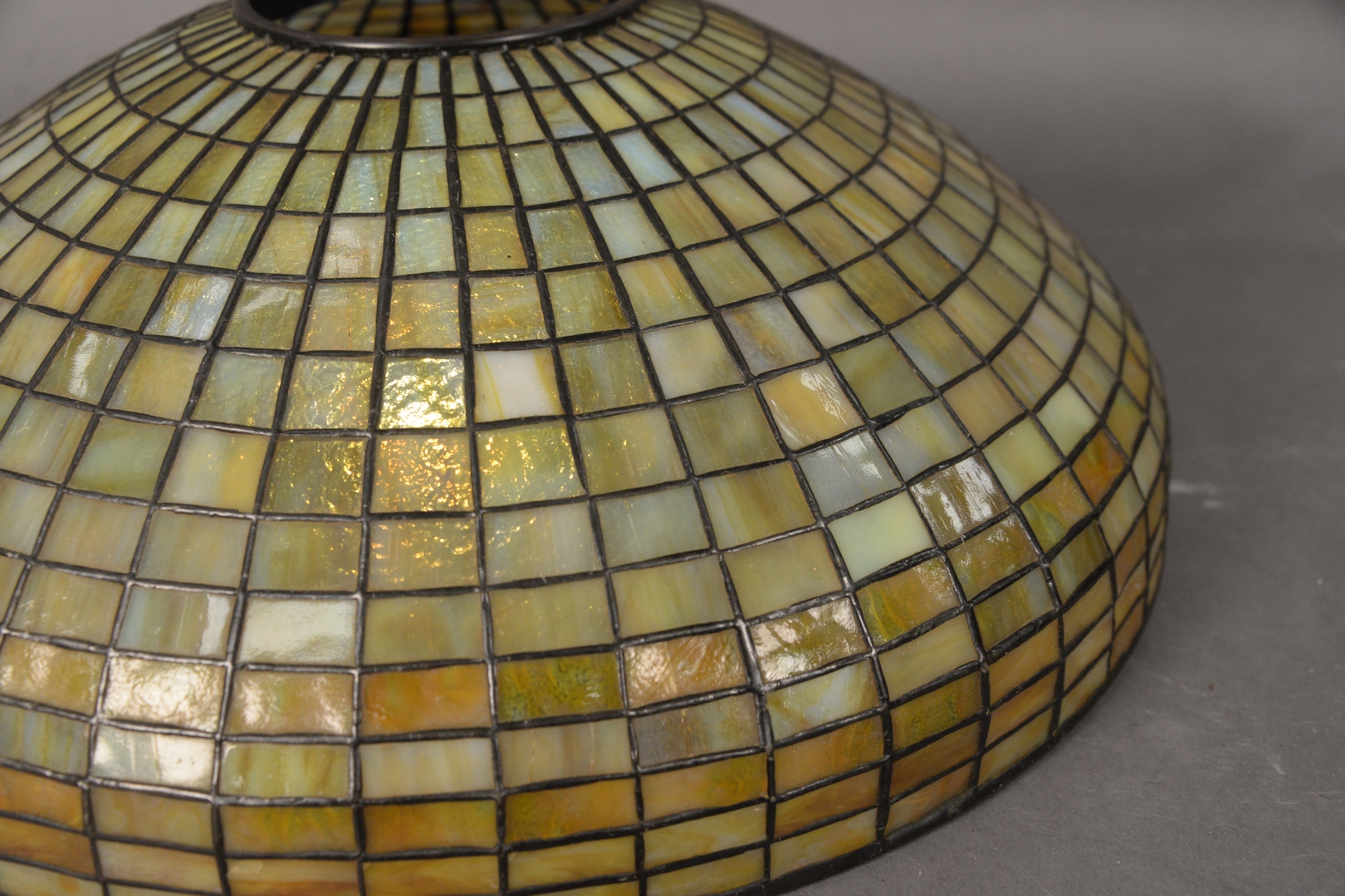 Lot 704: Tiffany Studios Geometric Leaded Glass Shade, domical with amber geometric brick pattern in 14 rows, marked ‘Tiffany Studios, New Yo…