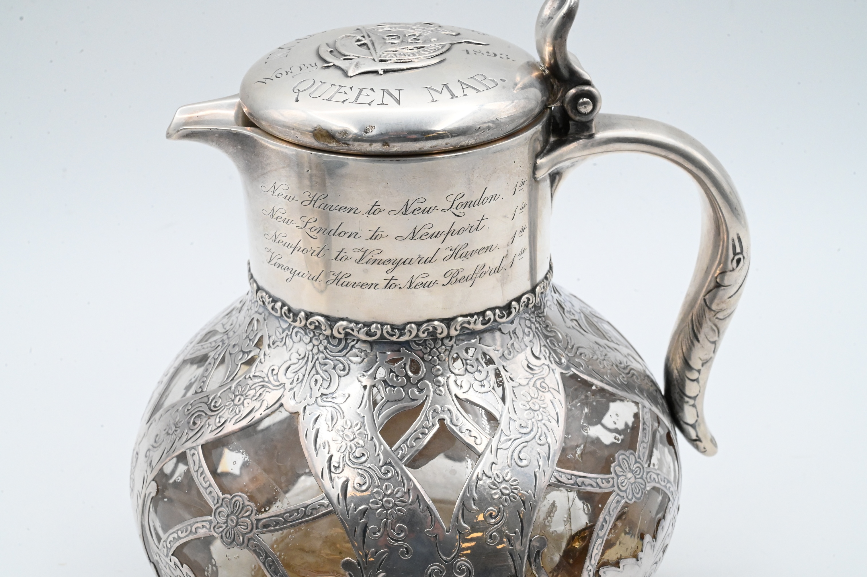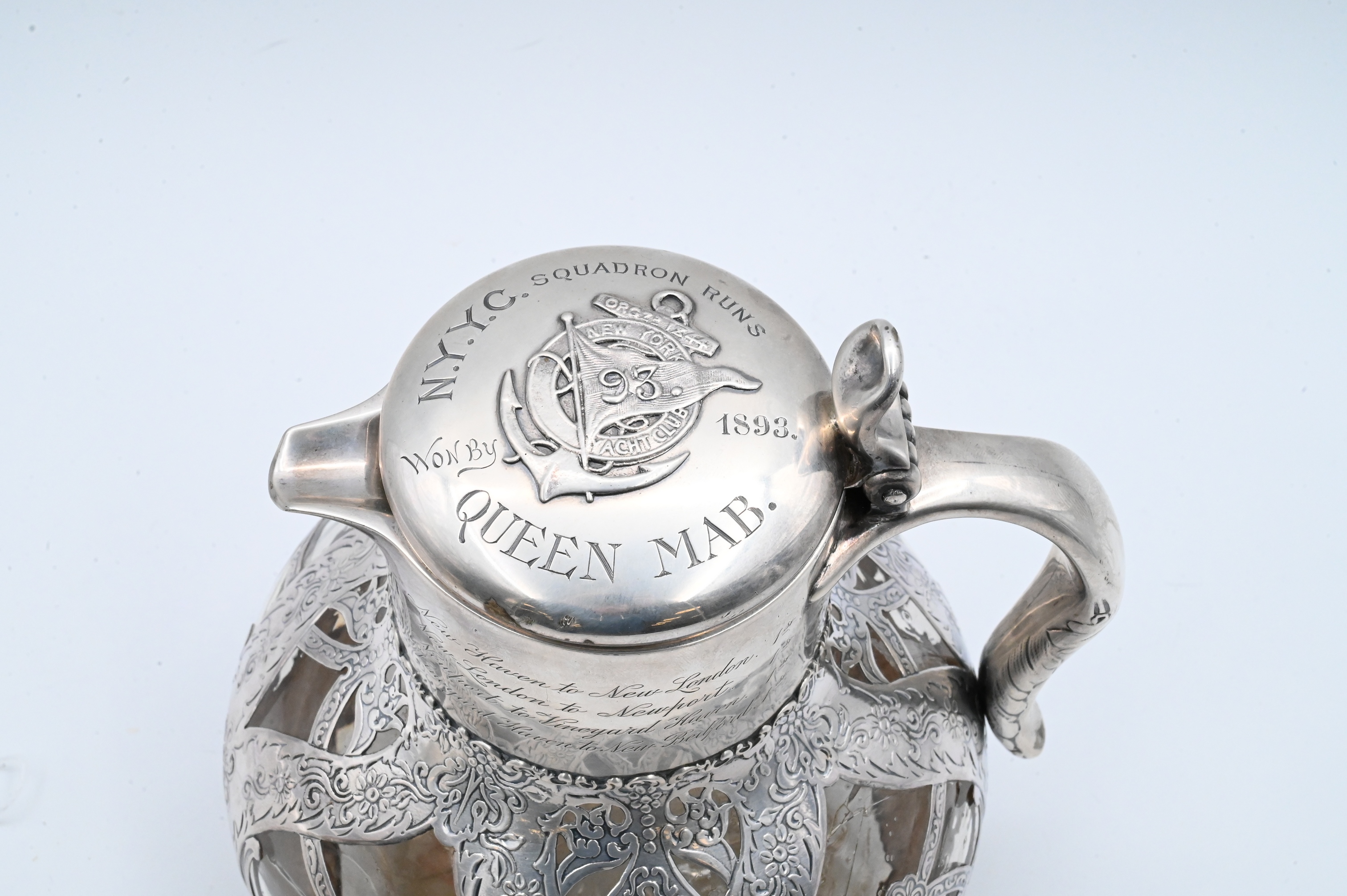 glass body encased in a finely pierced and engraved sterling silver mount with floral and foliate motifs, hinged lid engraved “N.Y.Y.C. Squadron Runs, Won by Queen Mab, 1893” with New York Yacht Club insignia, and side inscription listing race routes from New Haven to New Bedford, marked Whiting Mfg. Co., Sterling, 22891