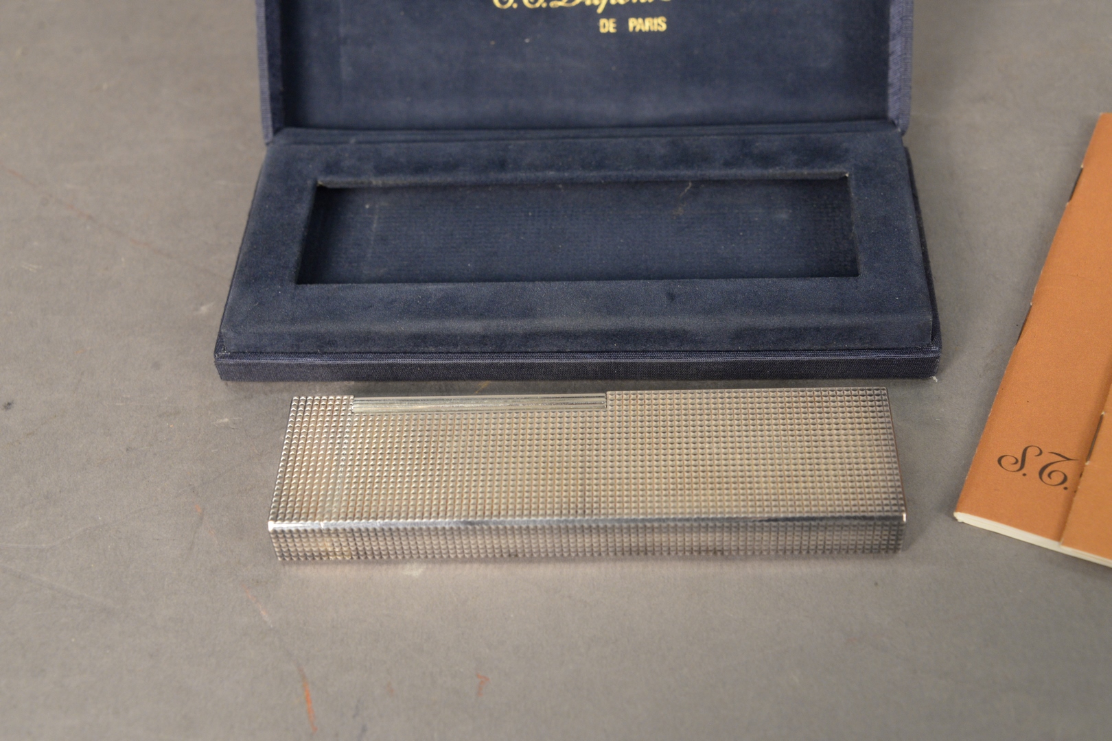 S.T. Dupont de Paris Silver Plated Table Lighter, marked to the underside S.T. Dupont, Paris, Made in France JP0027 in original fitted box, length 5 1/2 inches, width 1 1/2 inch.