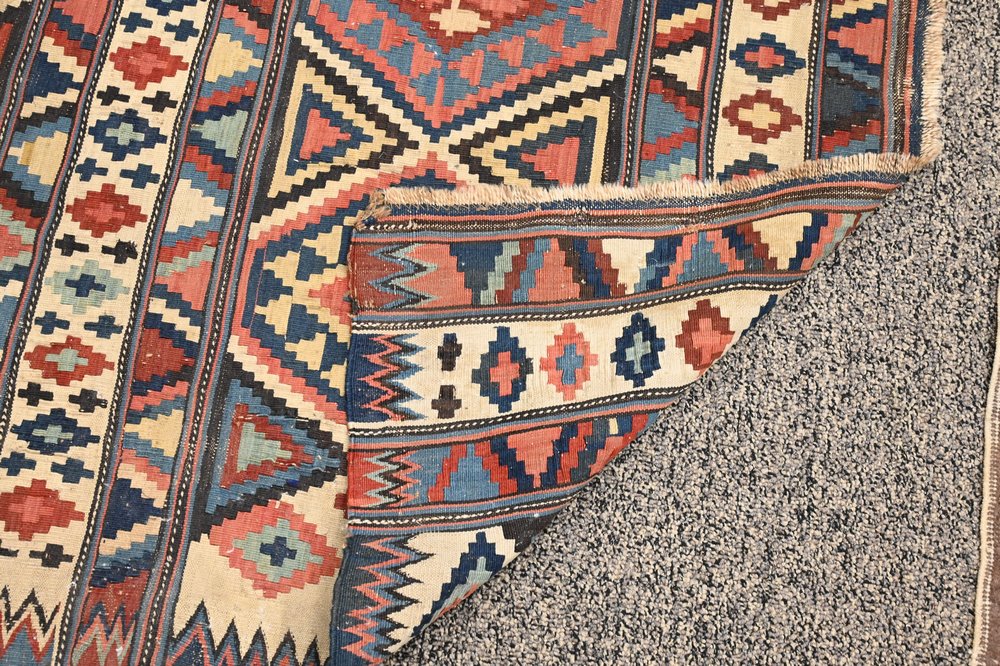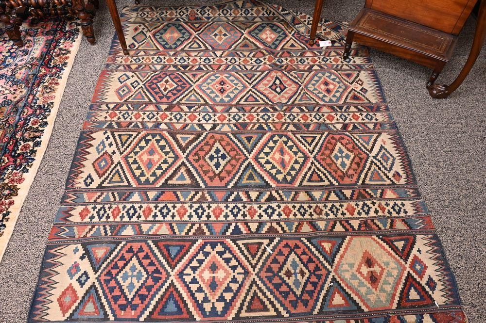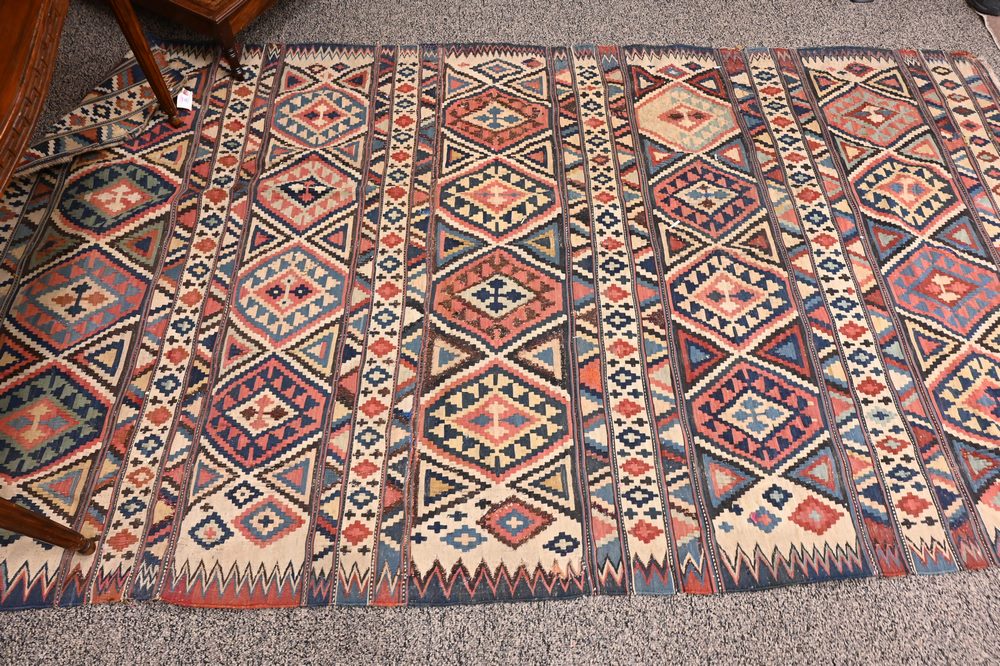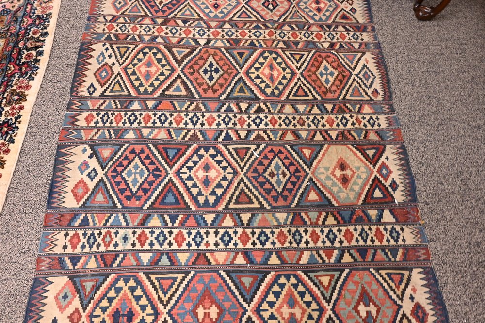 Lot 707: Kilim Flat Weave Area Rug, 4′ 8″ x 8′ 8″, late 19th century.