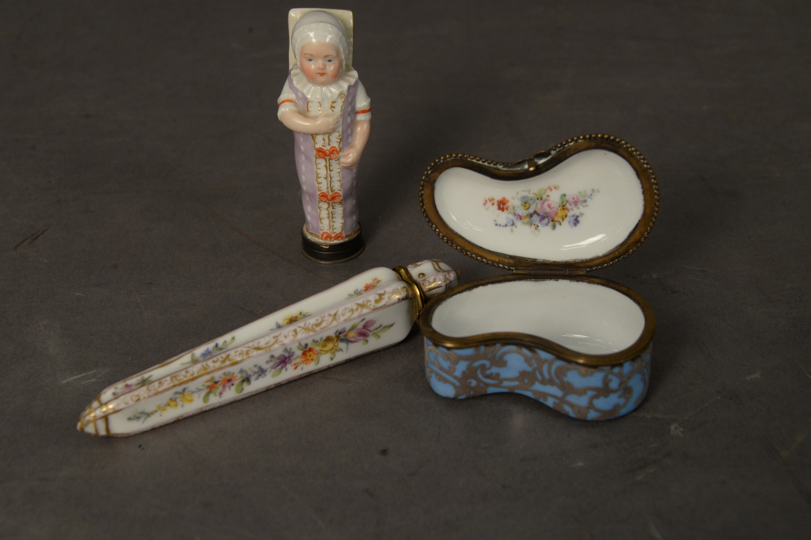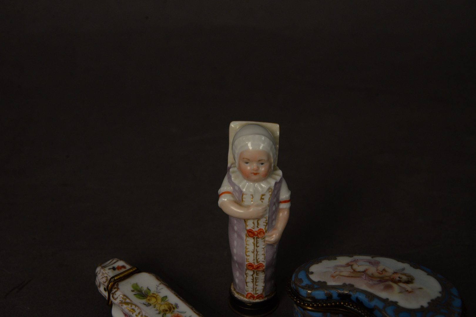 Lot 707: Three Porcelain Boxes to include one in the form of a swaddled baby having a sterling silver cover one small blue silver overlay bo…