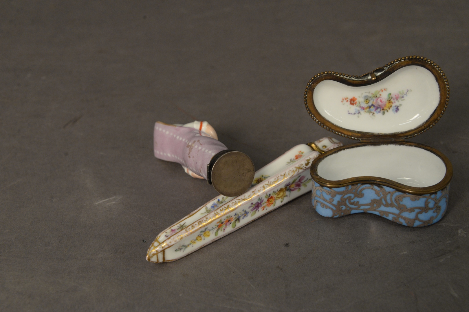 Three Porcelain Boxes to include one in the form of a swaddled baby having a sterling silver cover one small blue silver overlay box marked with crossed swords along with a long porcelain bottle, largest height 5 inches.
