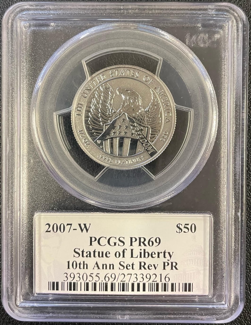 2007 W PCGS PR69 $50 Statue of Liberty, 10th Anniversary set reversed, pair platinum