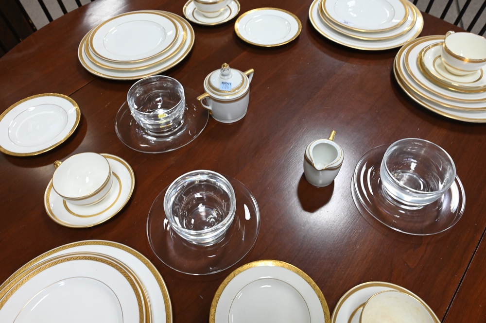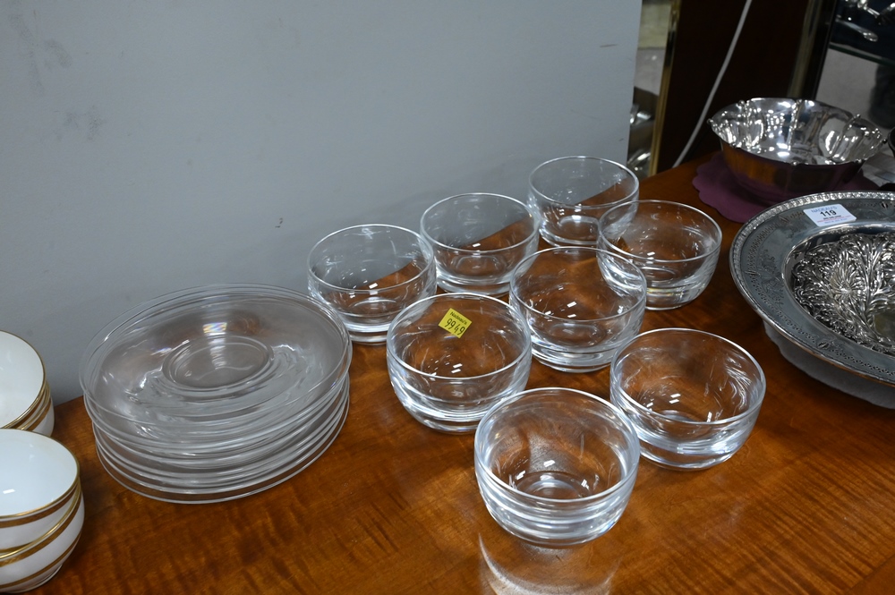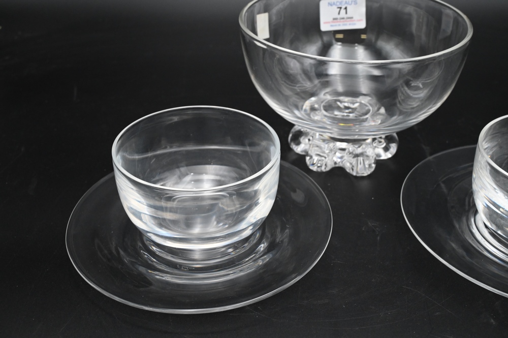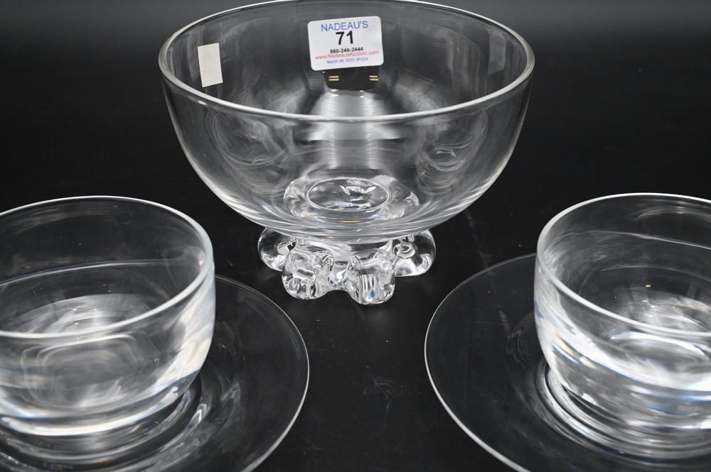 Lot 71: 12 Steuben Crystal Finger Bowls and Underplates, along with a centerpiece bowl, height 4 1/2 inches, diameter 6 1/2 inches; height o…