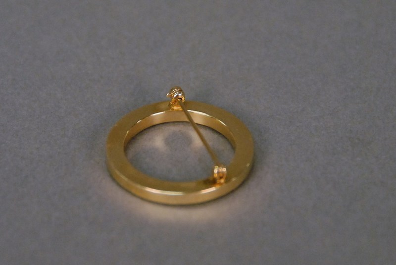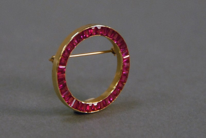 Lot 71: 14K gold circular pin set with thirty four channel set emerald cut rubies. dia. 1 1/8in.