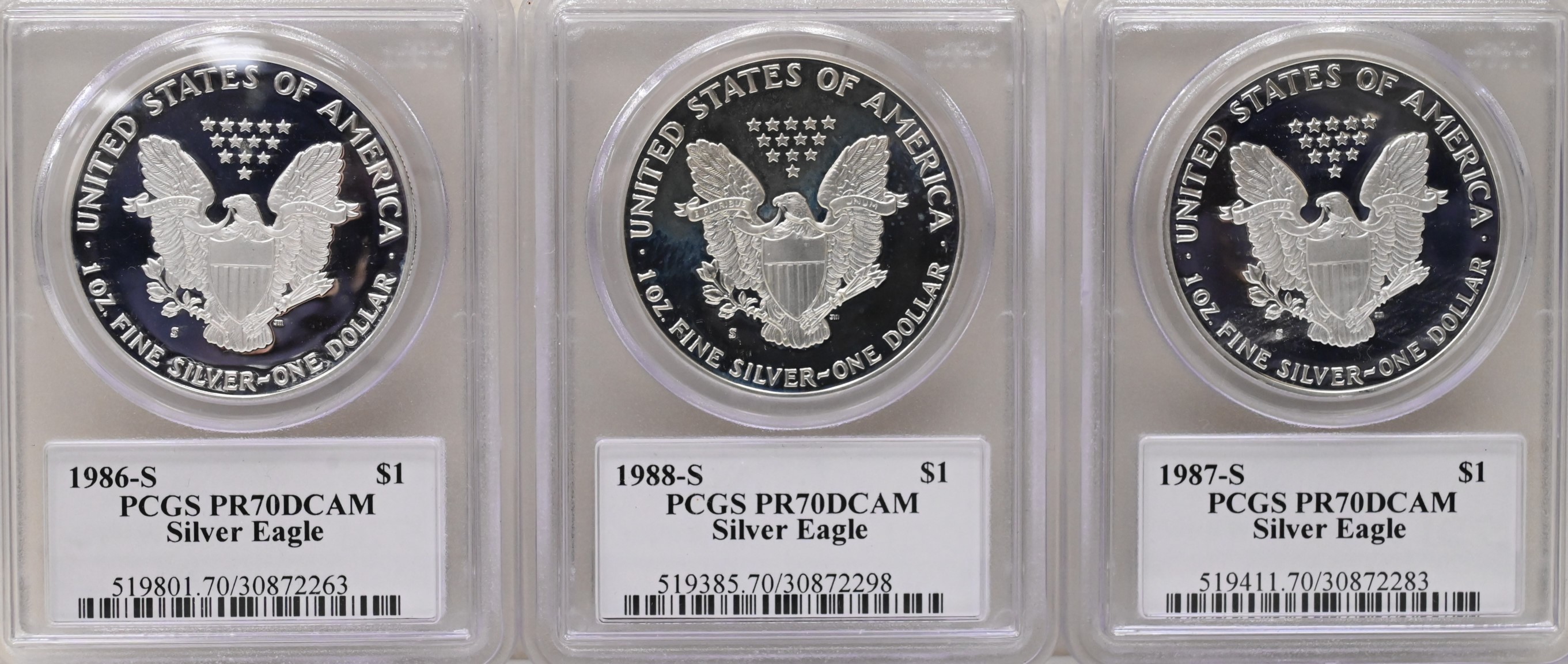 3 PCGS Deep Cameo MS 70 proof Silver Eagles, 1986-S, 1987-S, and 1988-S.
