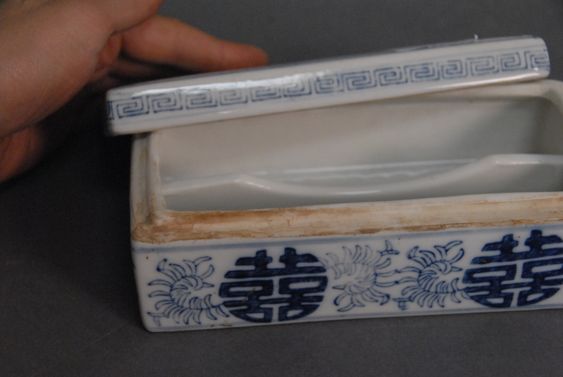 Blue and white porcelain covered box with divided inside having scrolling vine design and four character marks under cover, ht. 2 1/2in. lg. 7 1/2in.