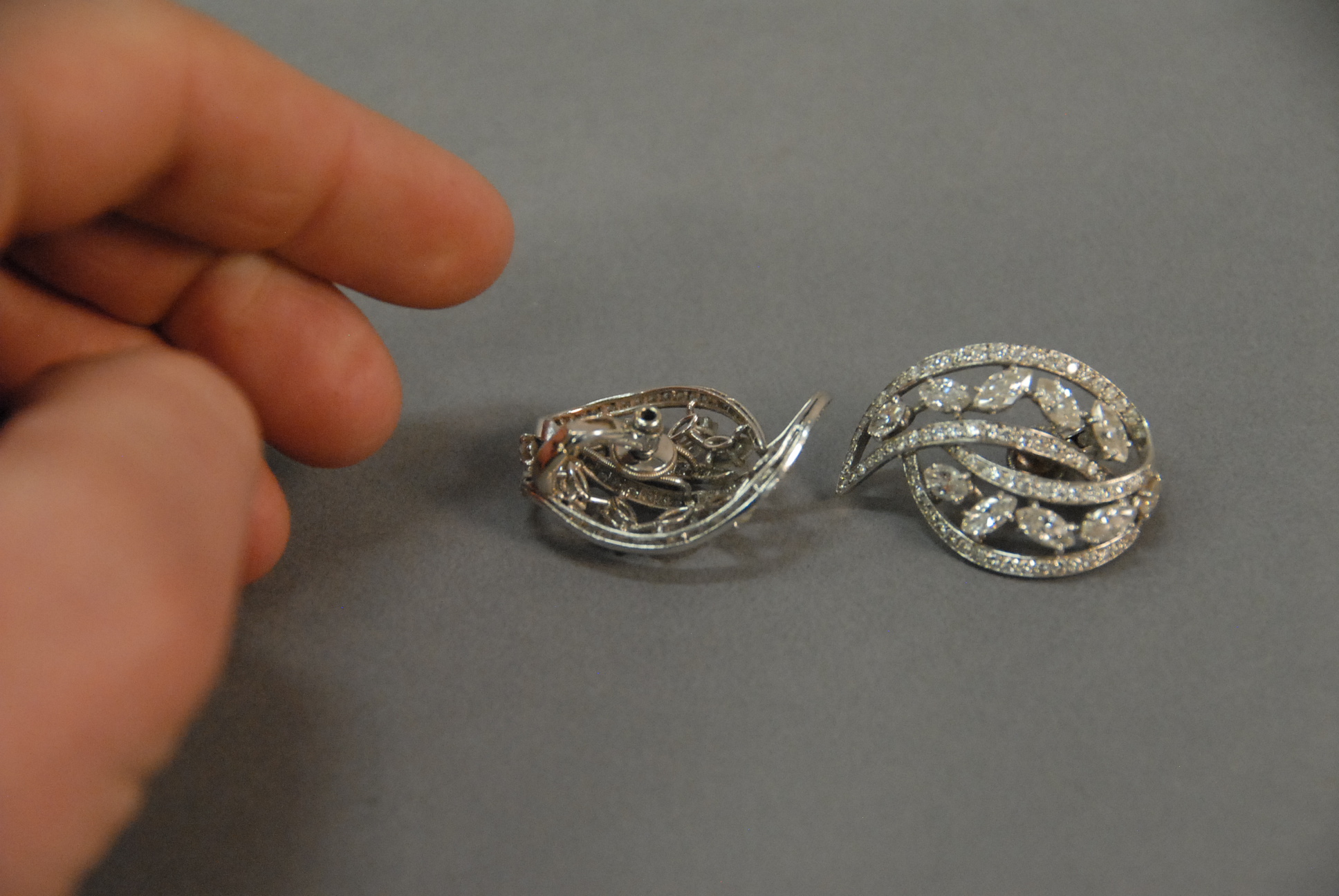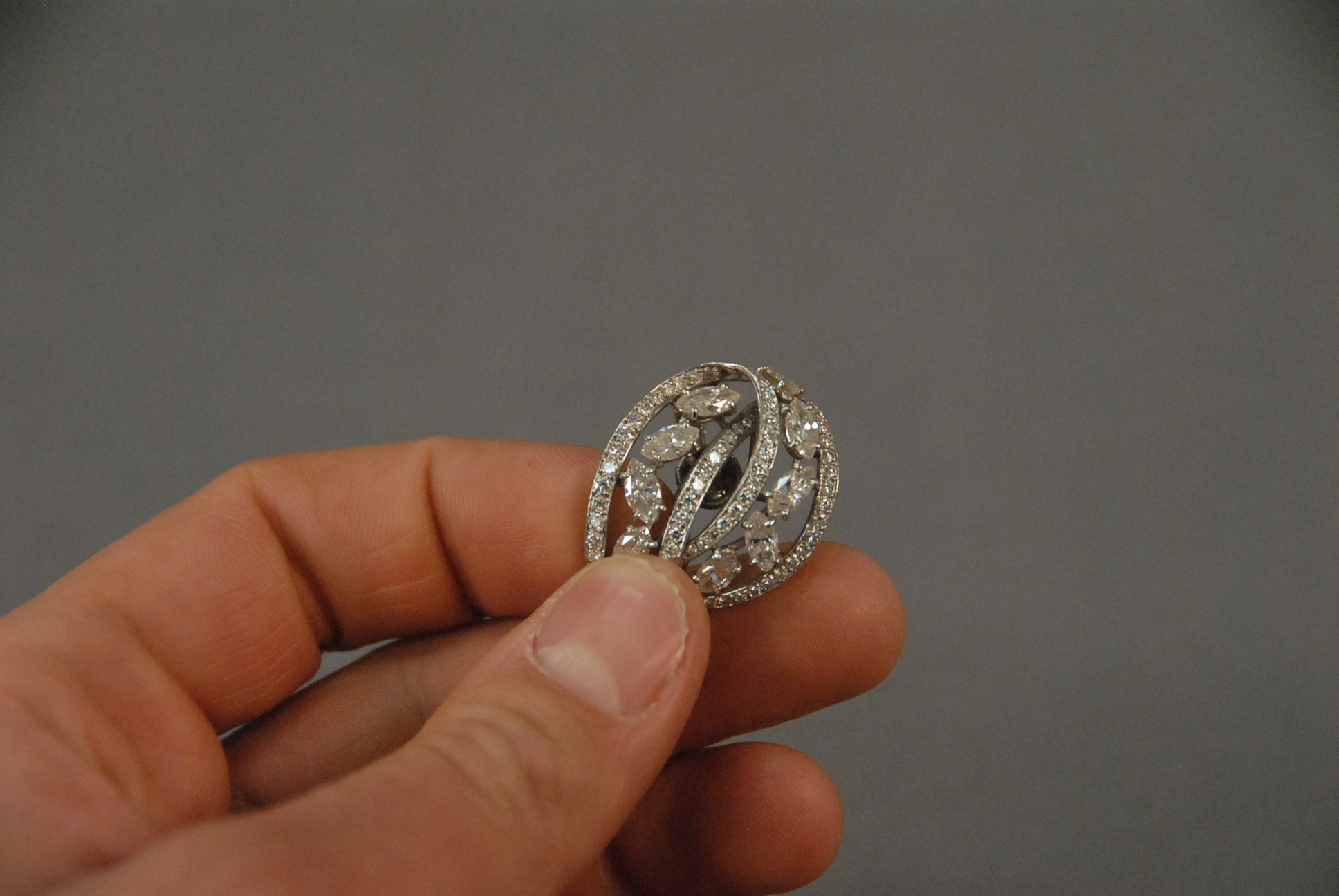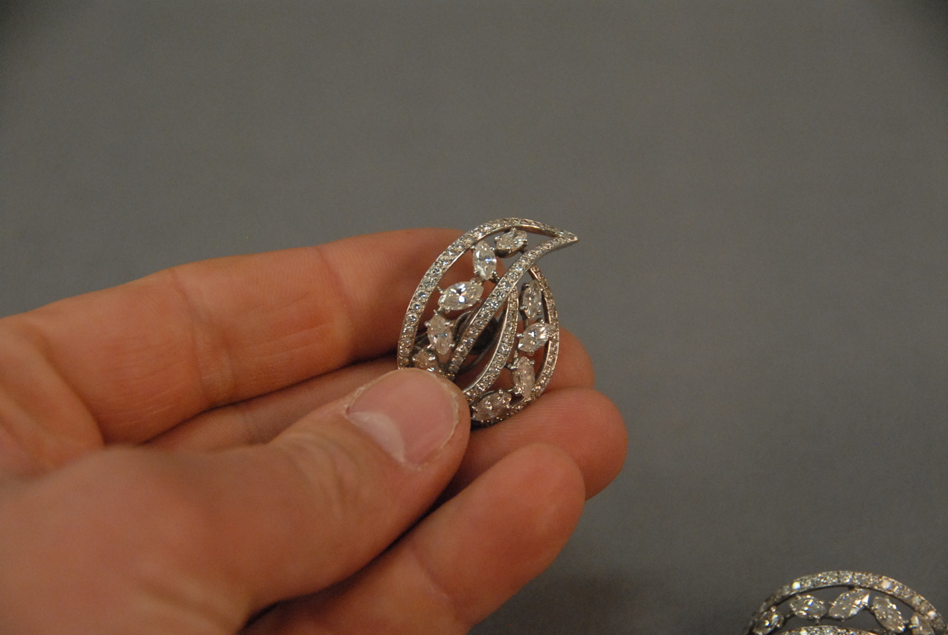 Lot 71: Cartier pair of platinum and diamond clip on earrings, each openwork set with ten marquis diamonds in each, flanked by approximately 88 small diamonds, diamond weight approximately 4cts. each, signed Cartier Paris. lg. 1 3/4in.