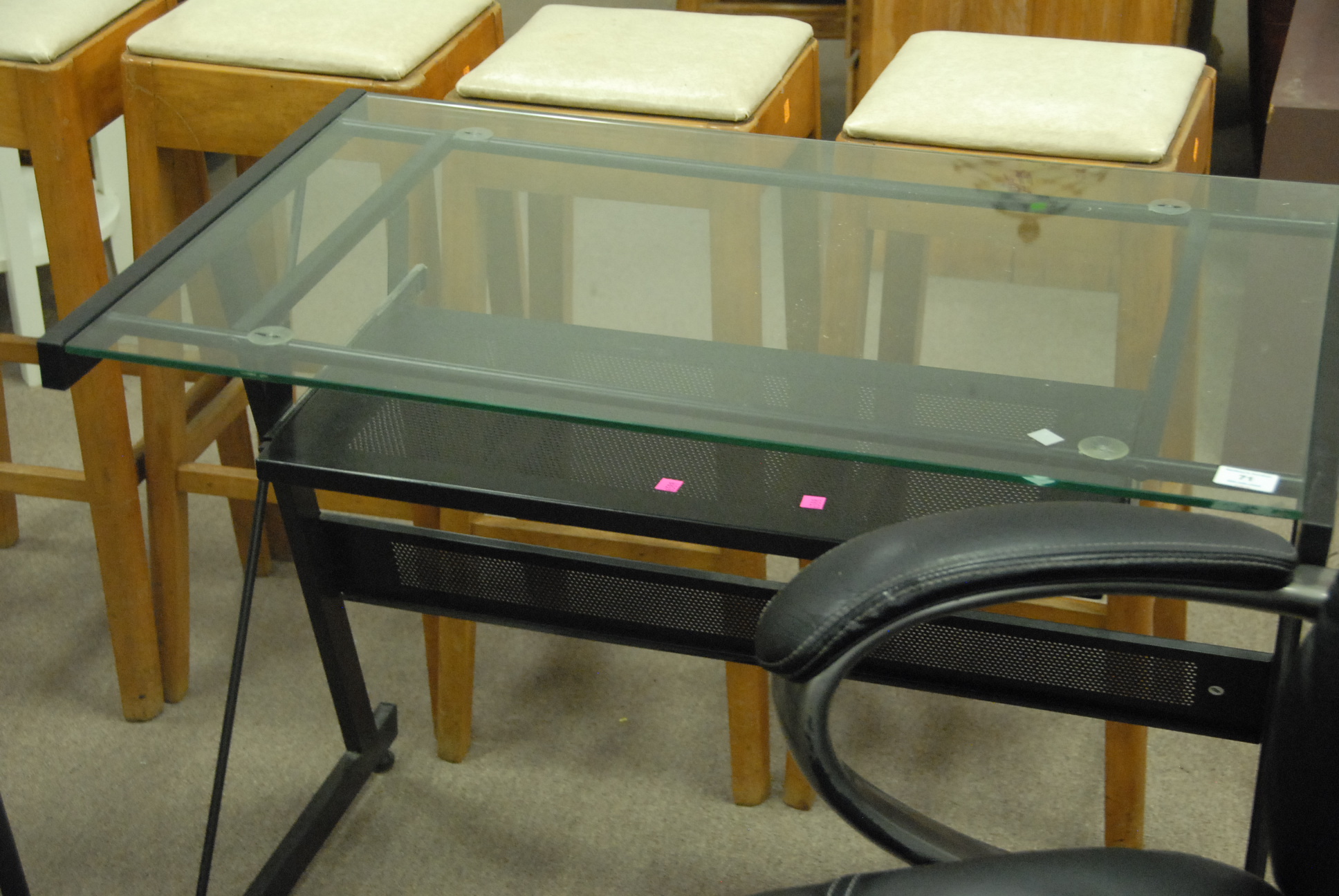 Contemporary glass top computer desk to include corner glass and office chair.