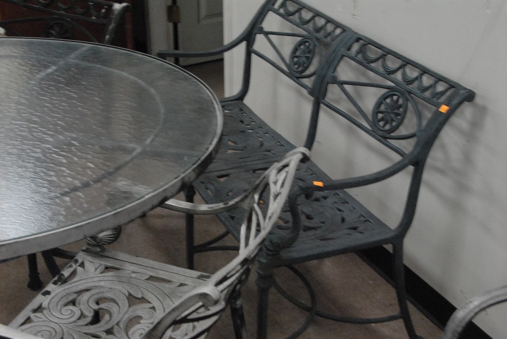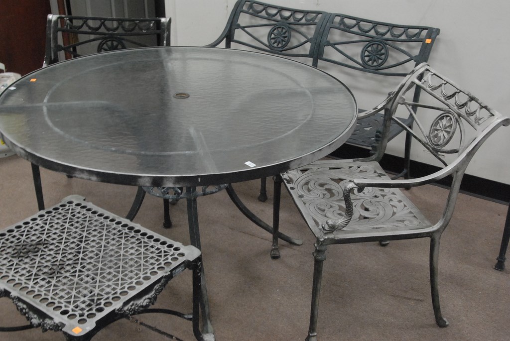 Five piece outdoor lot: table, two armchairs, bench, and small stand.