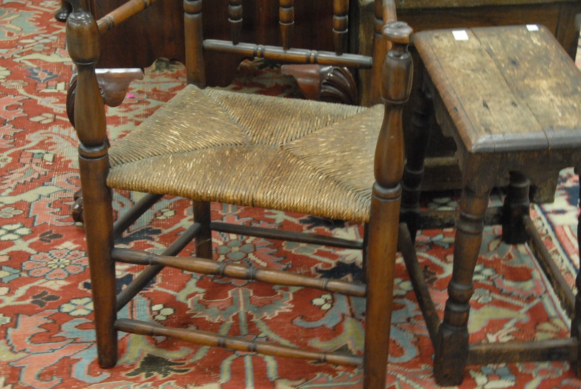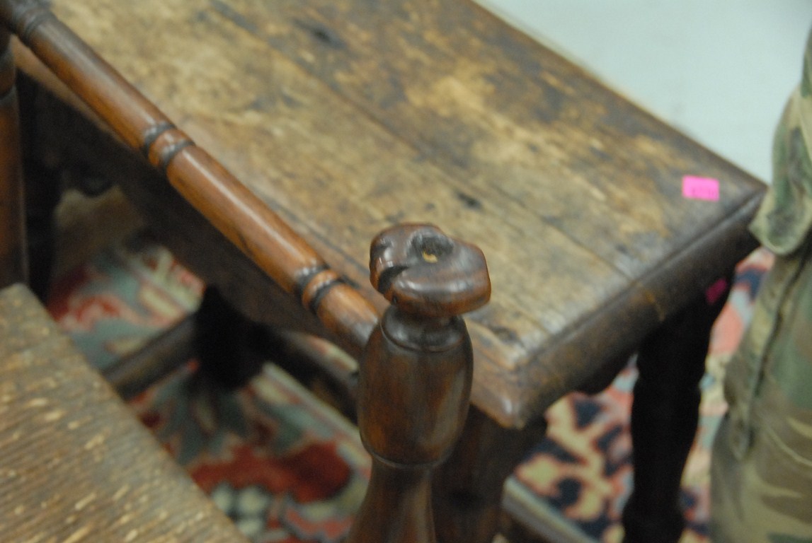Lot 71: Great chair with turned back legs and stretchers having turned hand rests hand rests chipped, ended out late 17th century. seat ht…