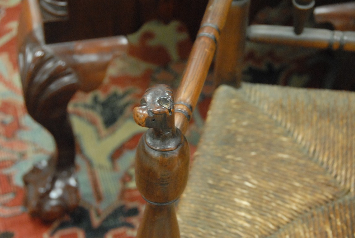 Great chair with turned back legs and stretchers having turned hand rests hand rests chipped, ended out late 17th century. seat ht. 17in.