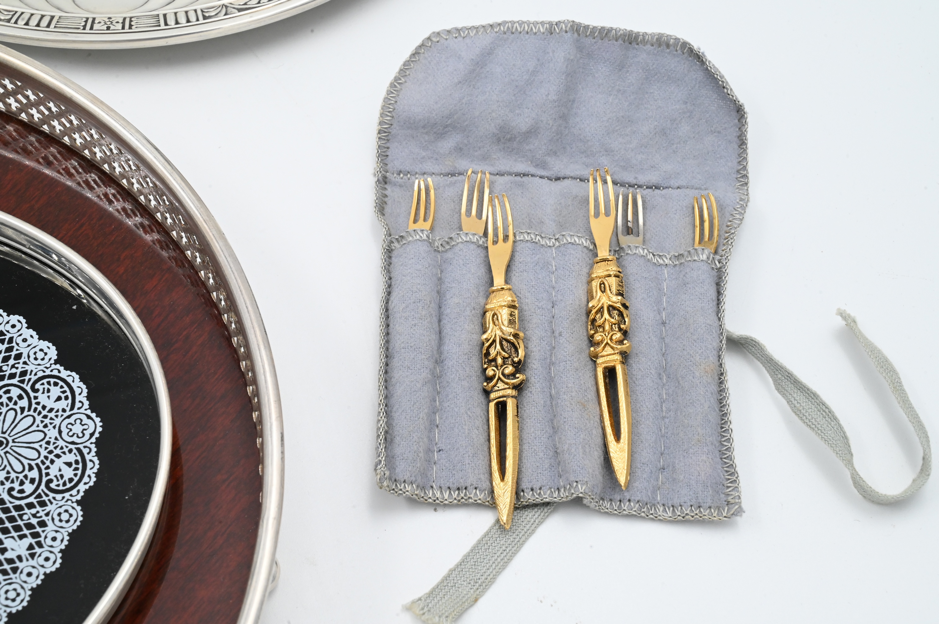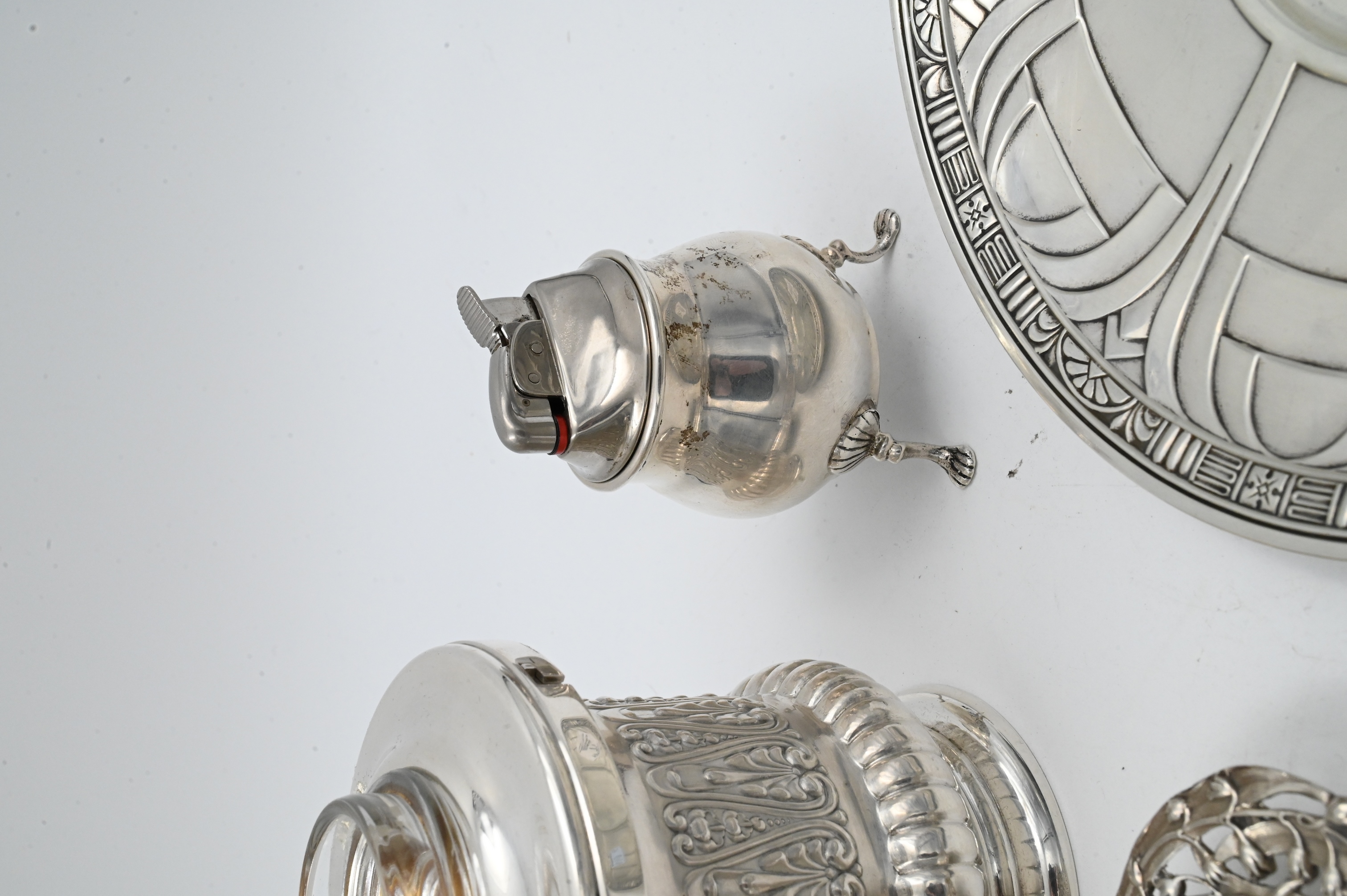to include sterling silver trays, one weighted sterling lighter, on silver rimmed glass tray, one sterling silver urn with removable cup, silver plate round tray and set of 12 small