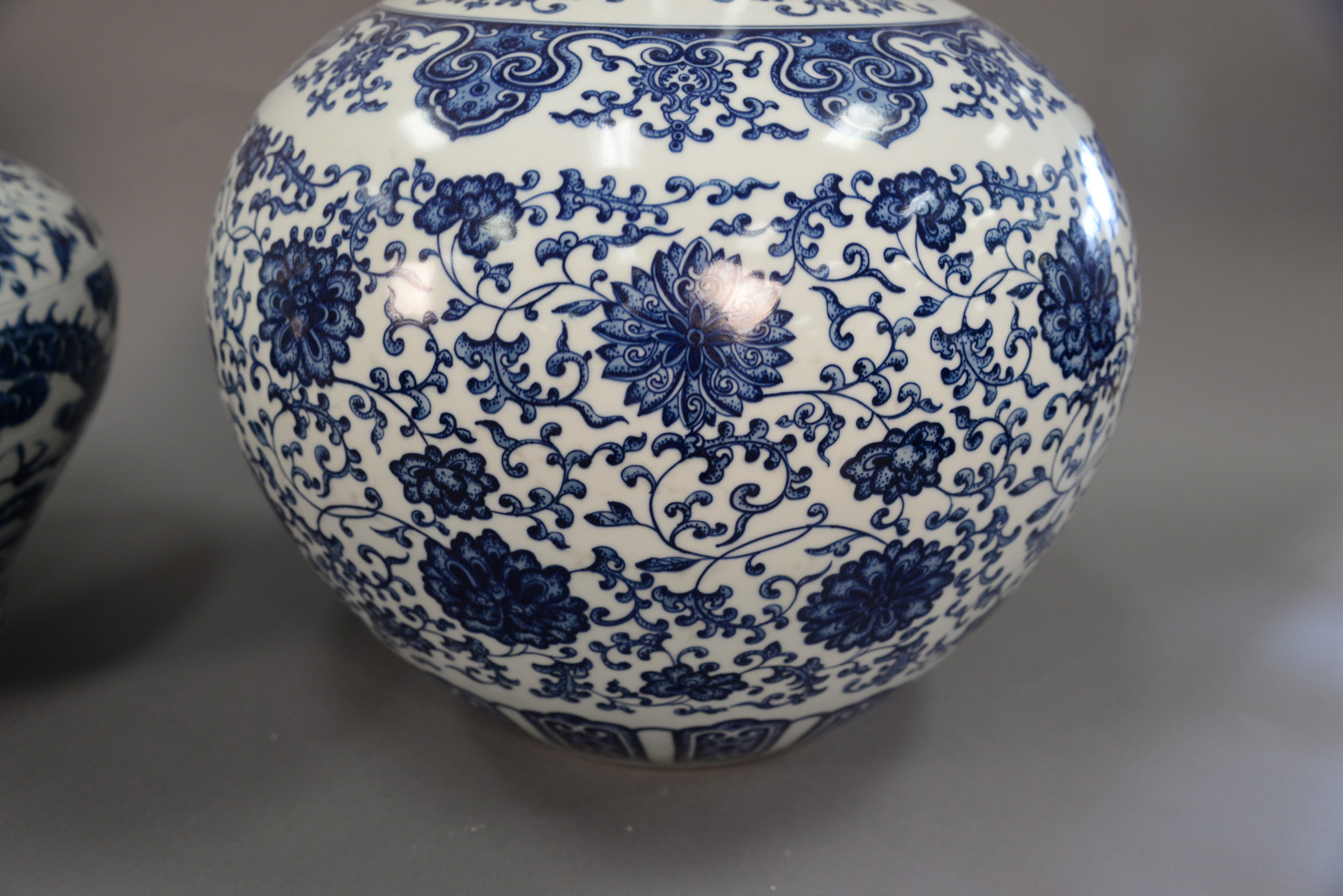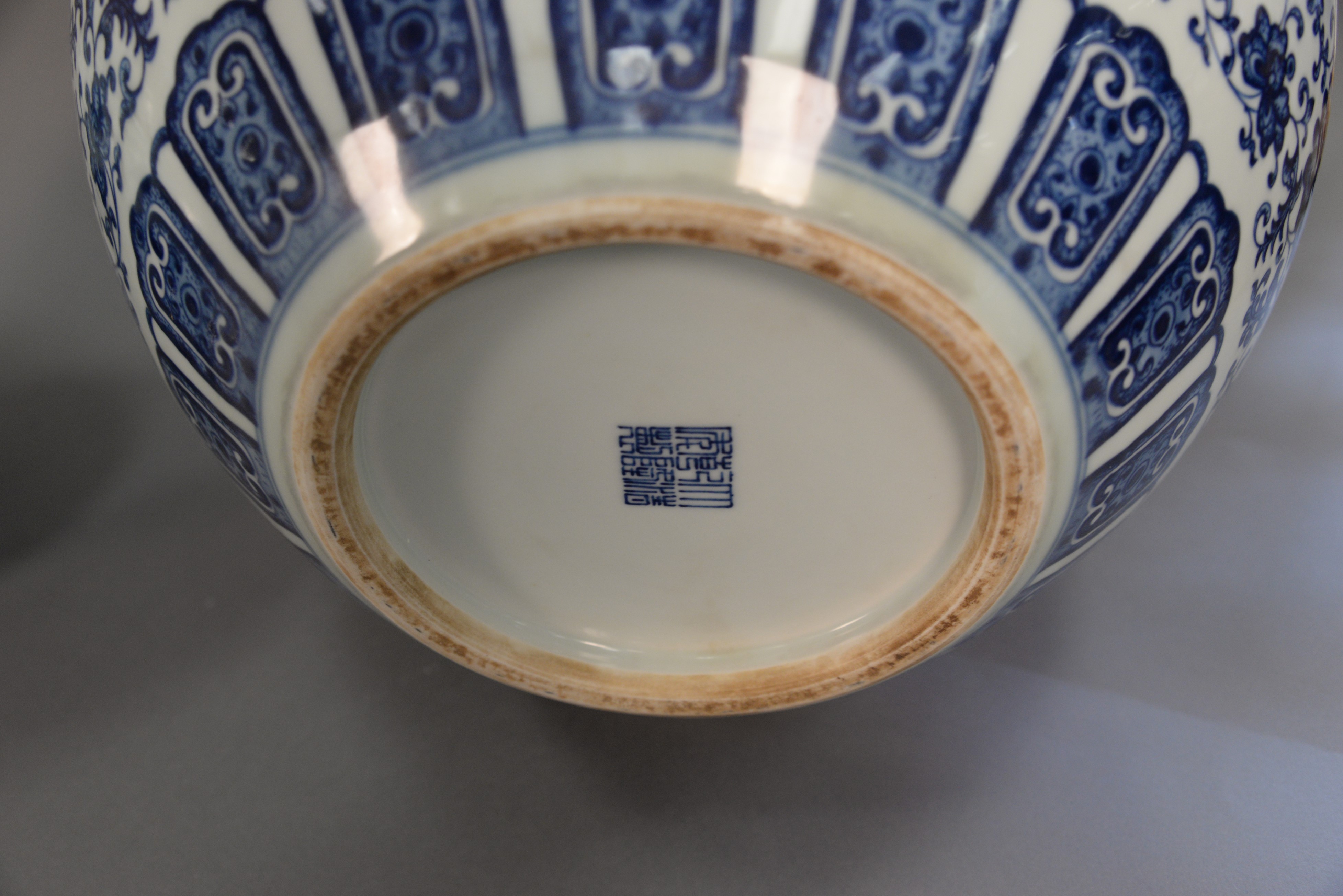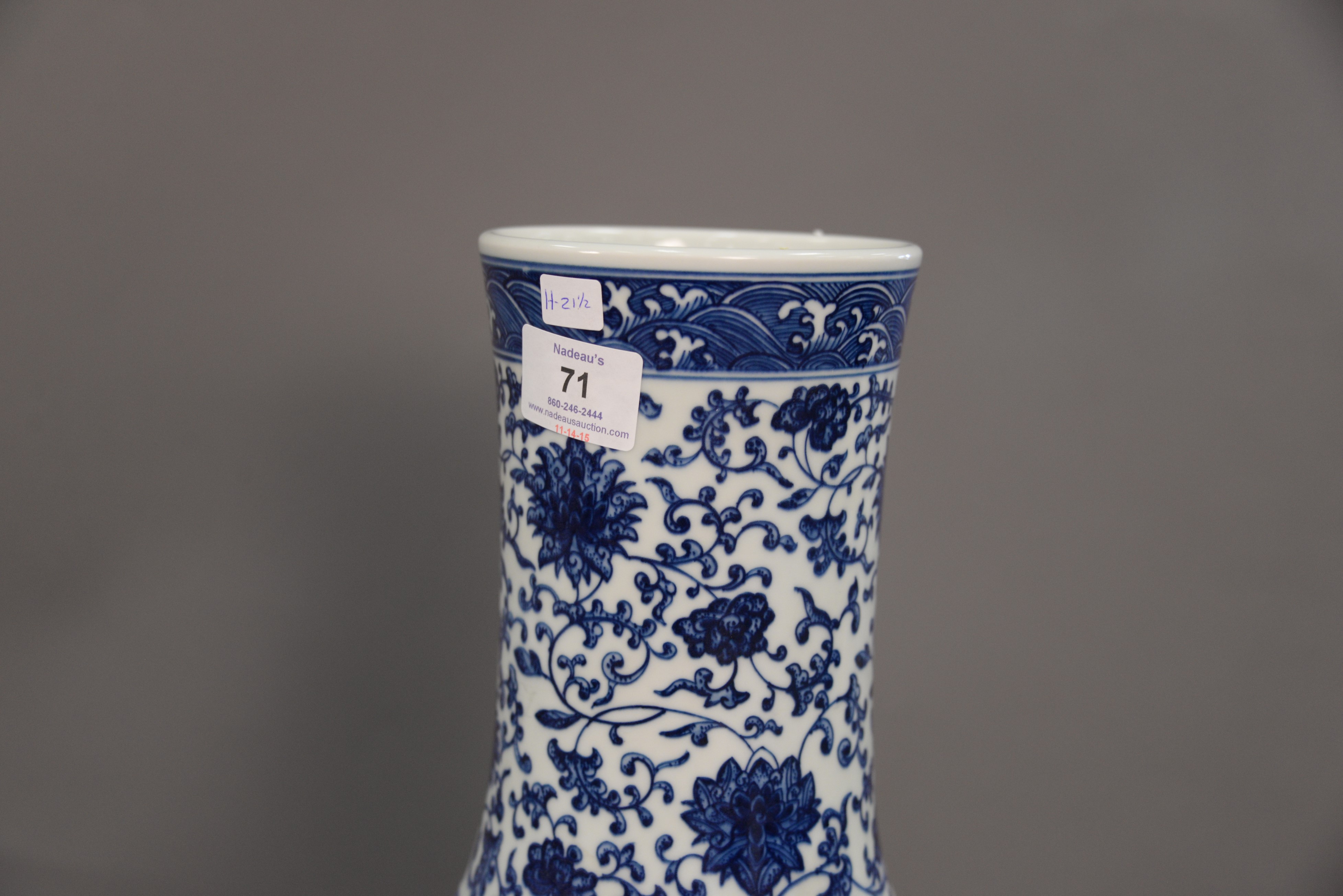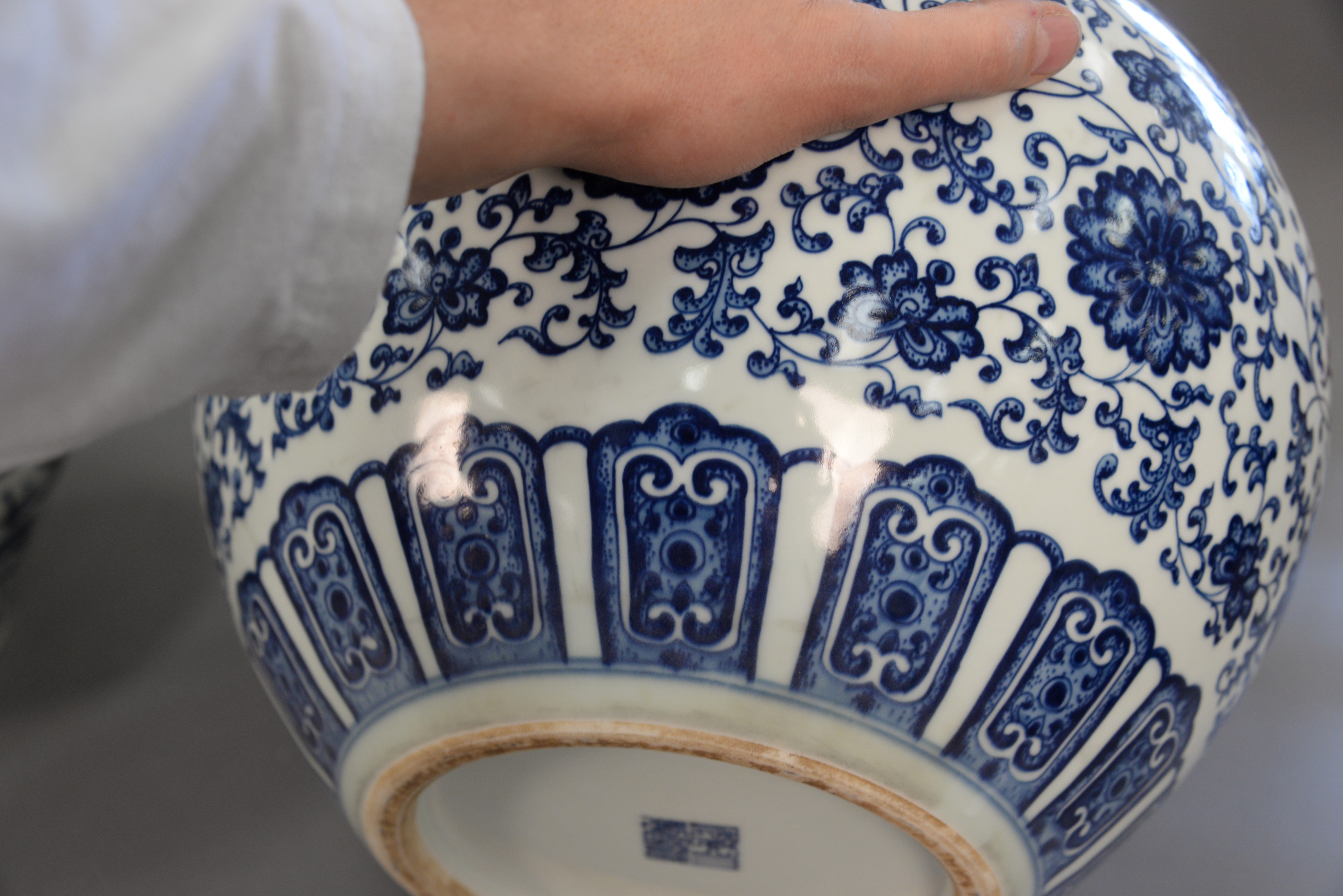 Lot 71: Large Chinese blue and white globular vase with painted scrolling vines with blossoming lotus, seal mark on bottom. ht. 21 1/2 in.