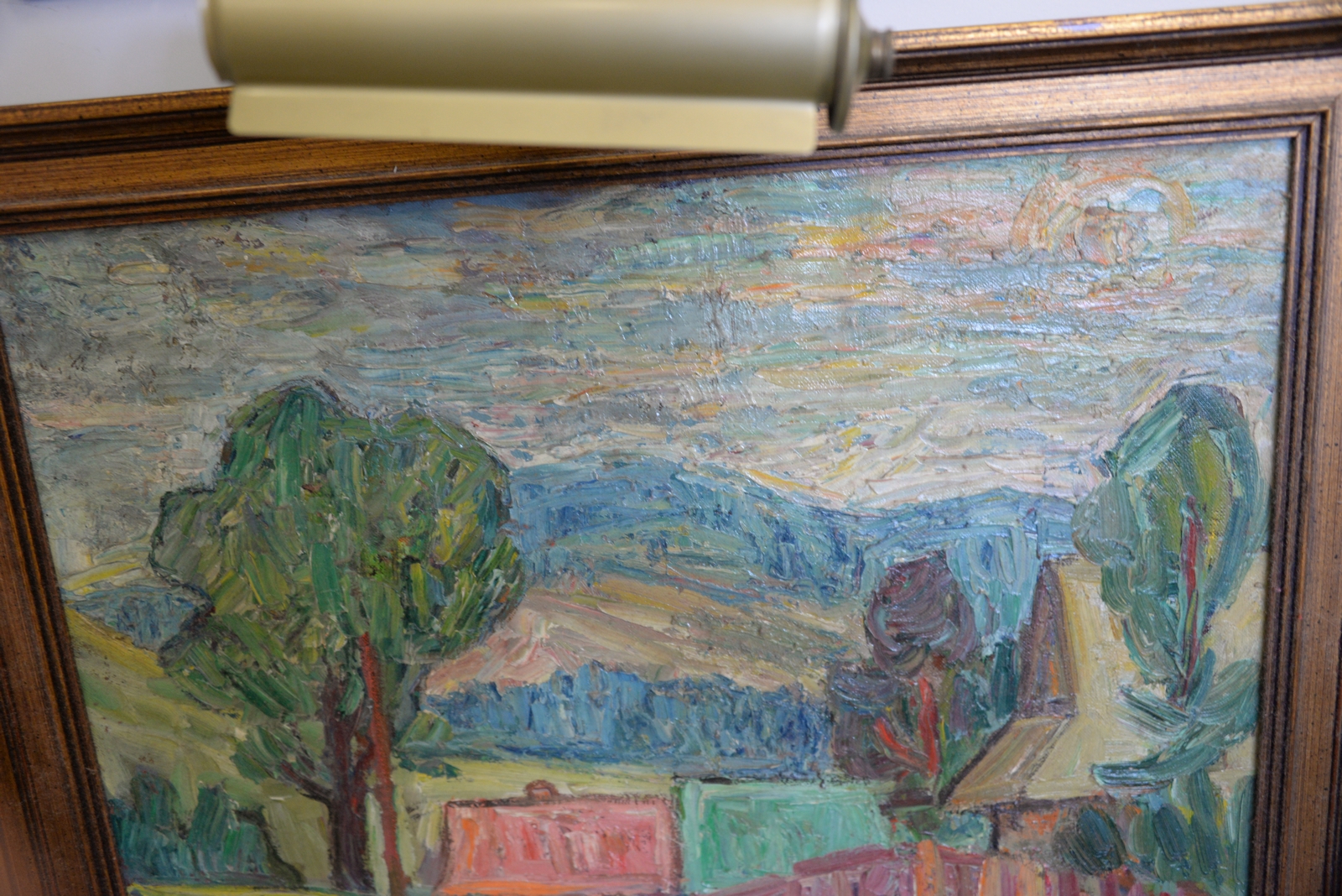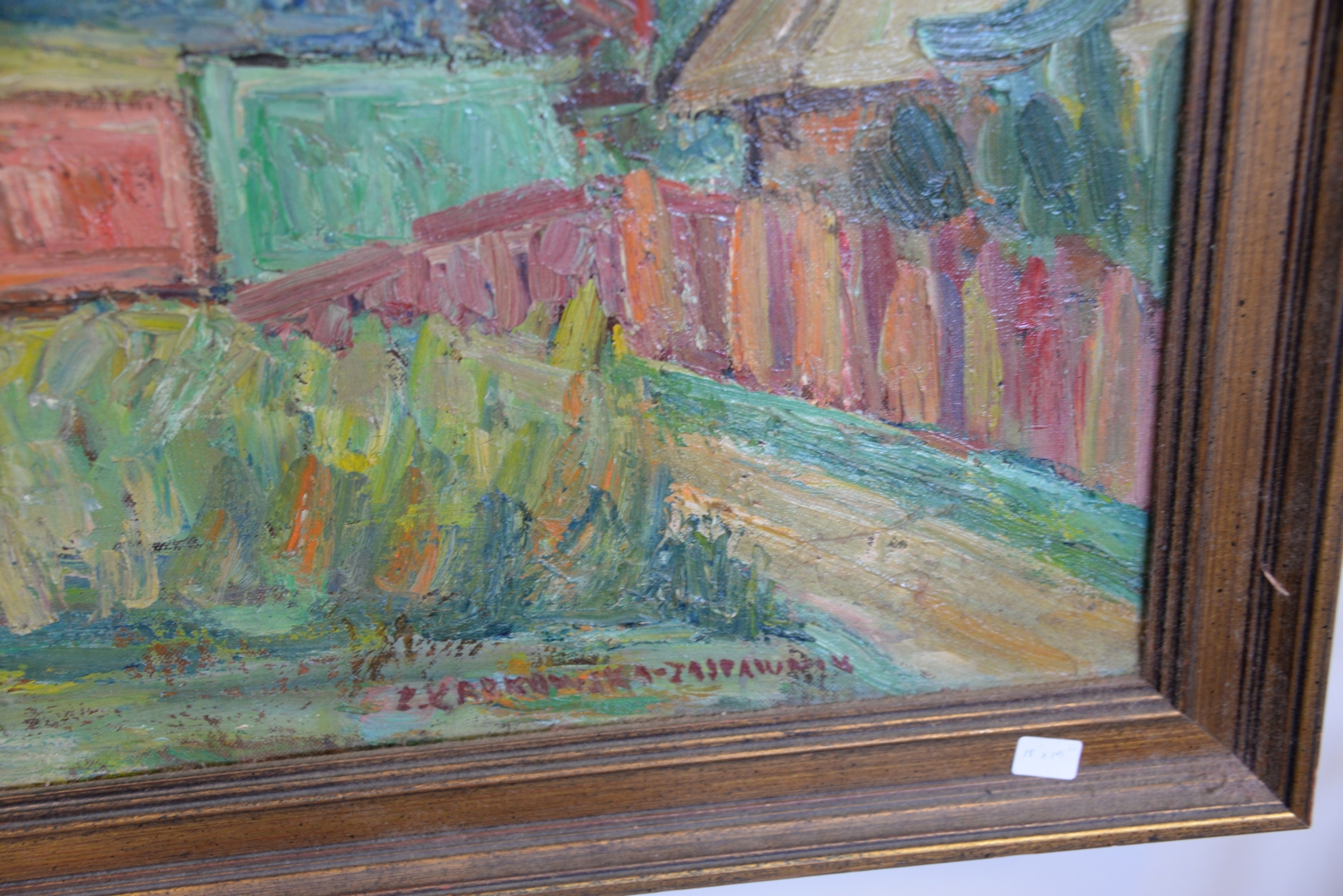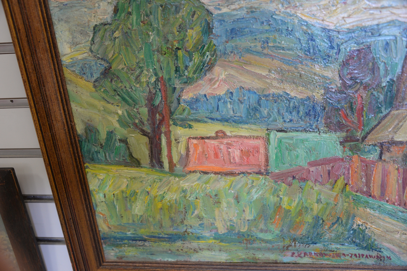 Oil on canvas polish farm landscape signed illegibly. 17 3/4 x 19 1/2