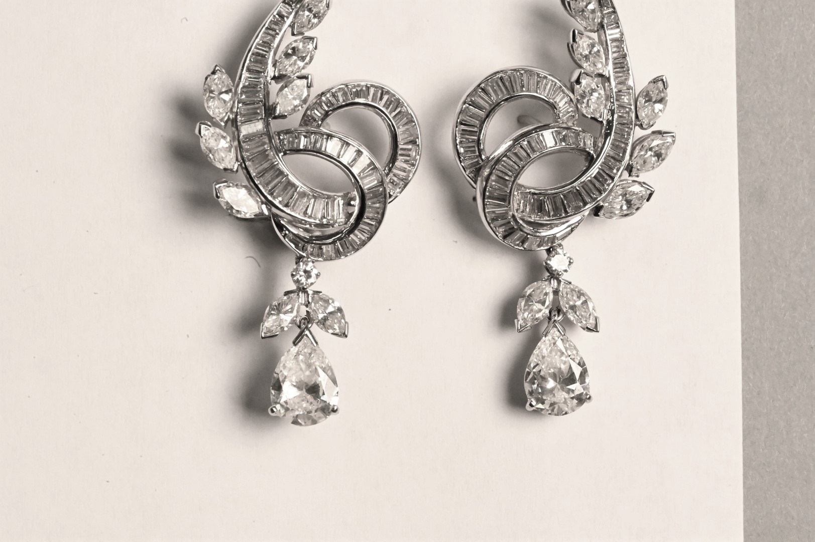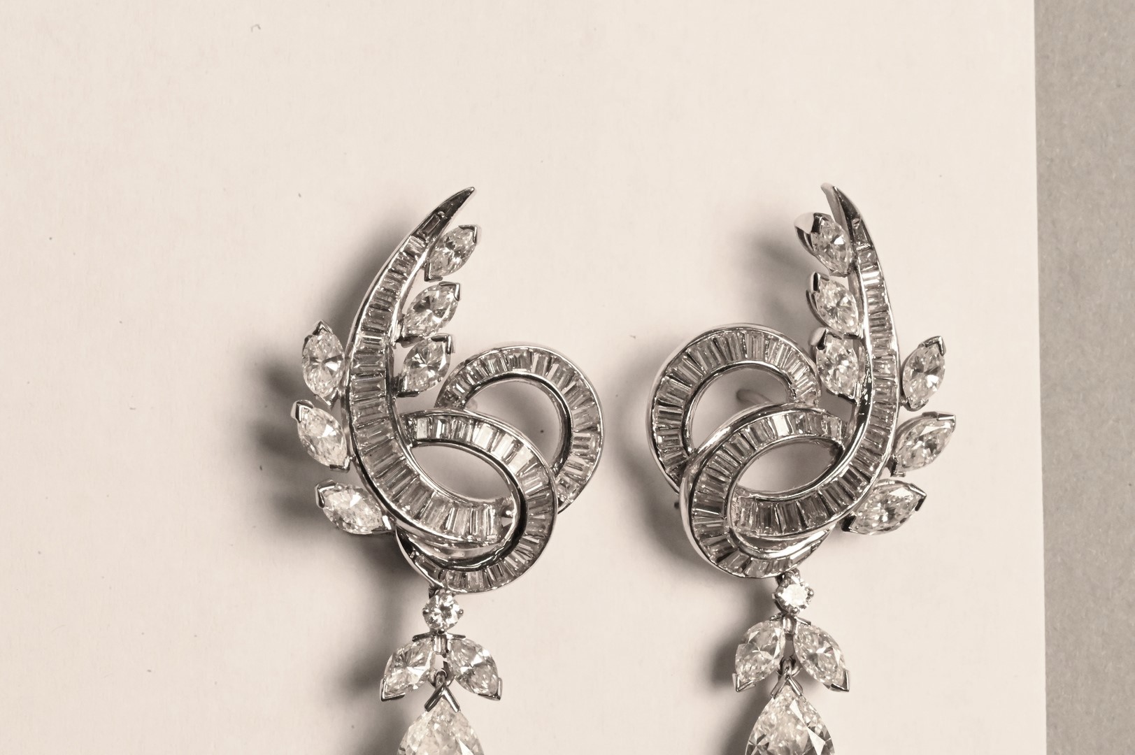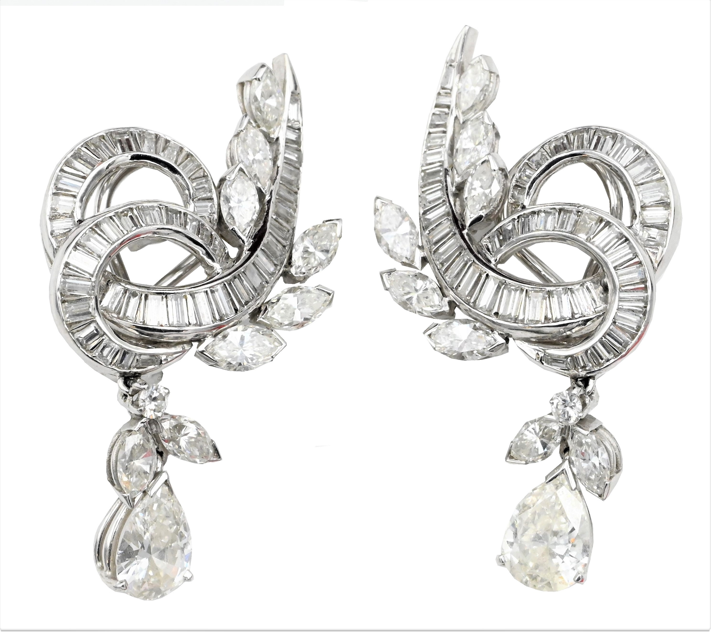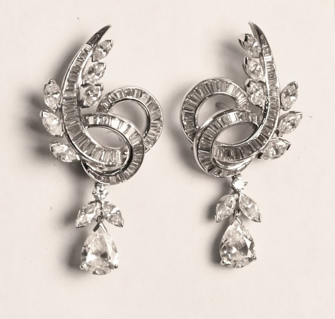 each having pear shaped drop, 8 marquis diamonds, 42 baguettes, along with 1 small round