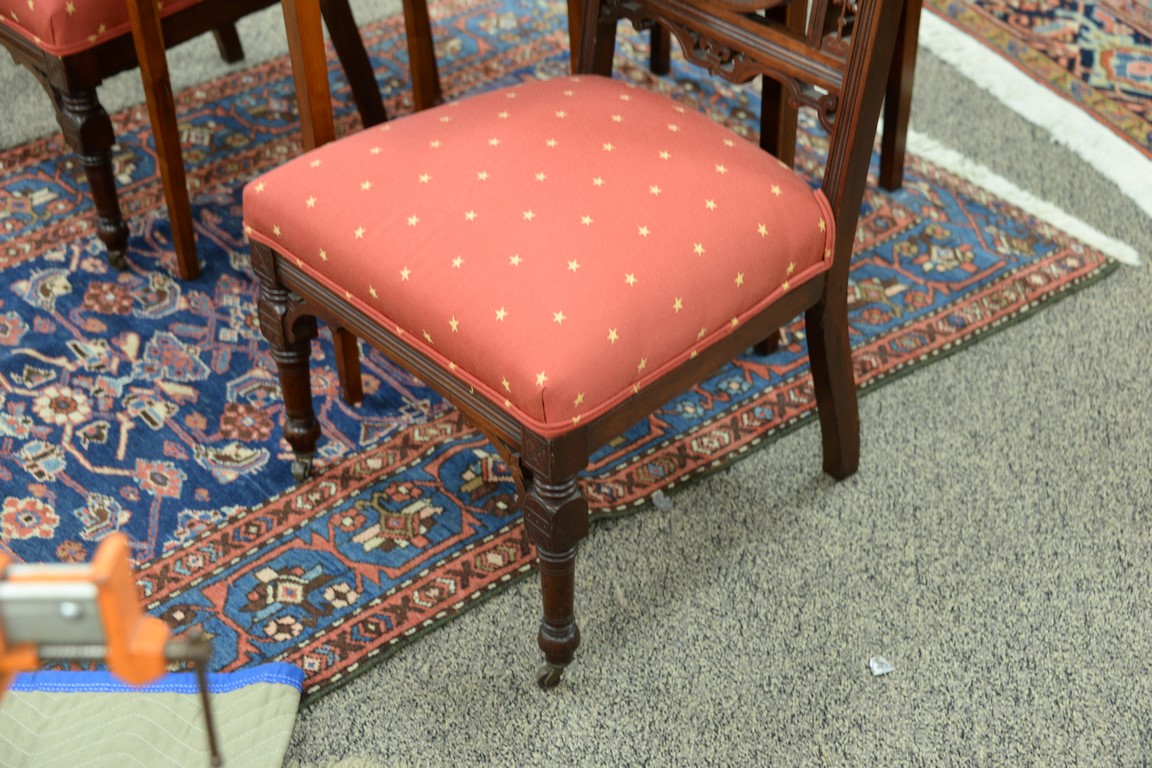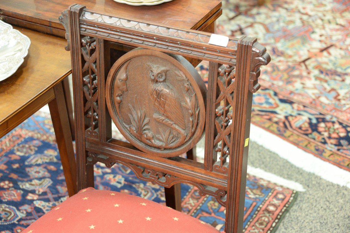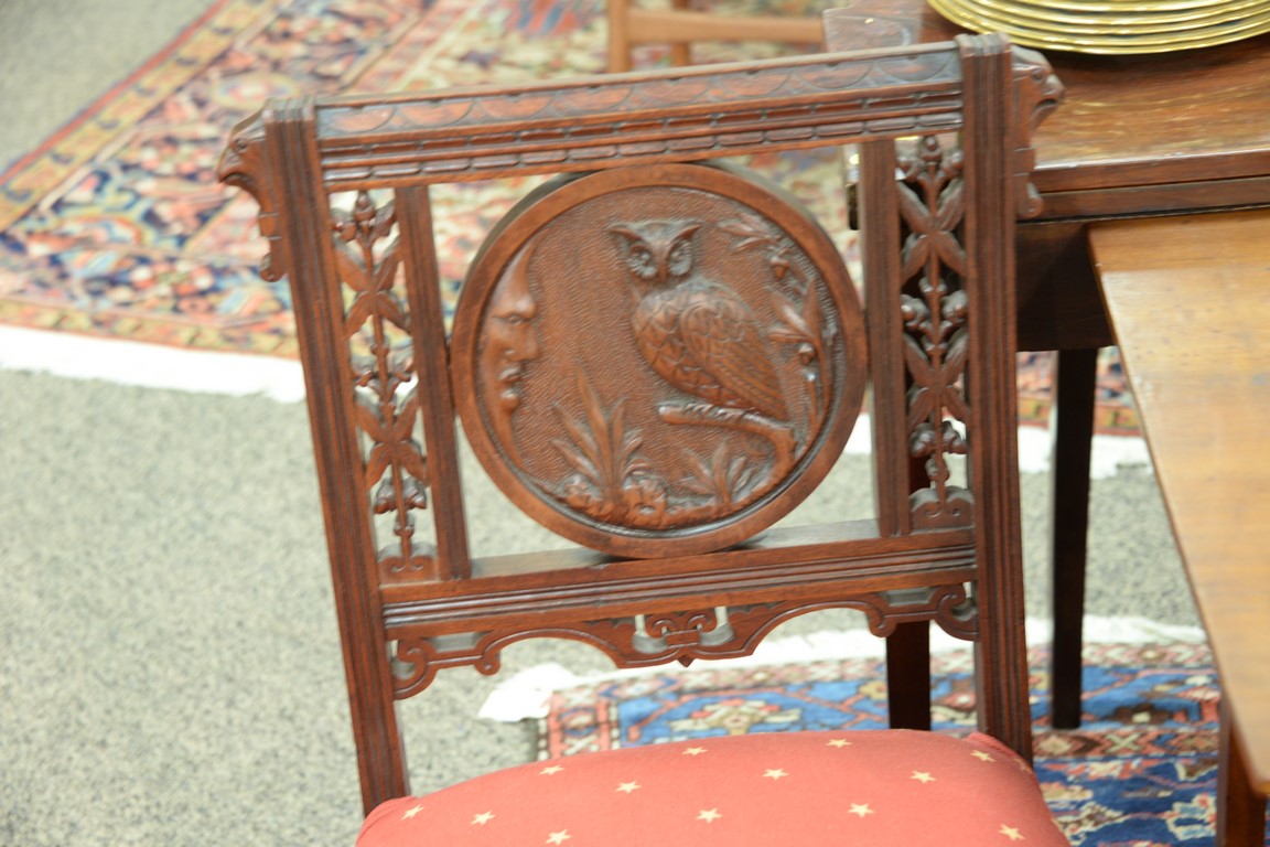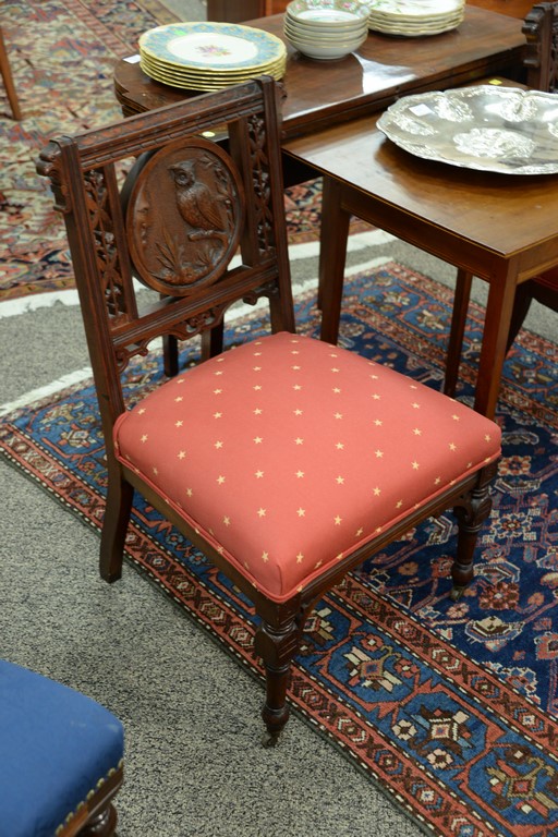 Pair of Victorian side chairs, backs with round panel depicting owls. seat height 16 inches, total height 33 inches Provenance: Estate of Dr. Steve Leder