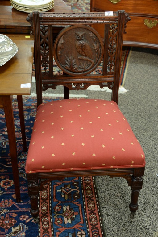 Lot 71: Pair of Victorian side chairs, backs with round panel depicting owls. seat height 16 inches, total height 33 inches Pro…