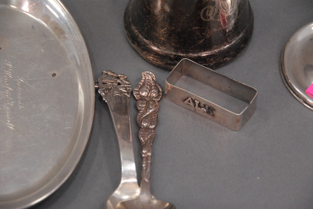 Sterling silver lot including mug, spoons, small tray, and cover, 10.1 t oz.