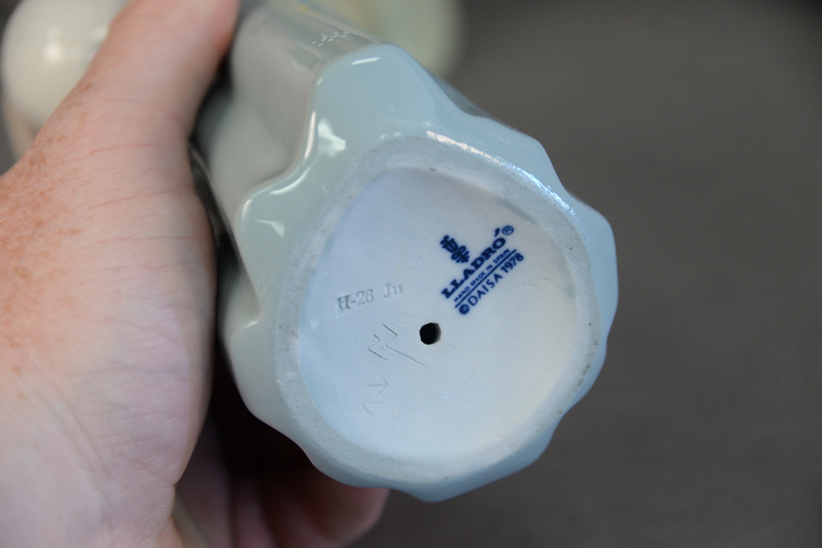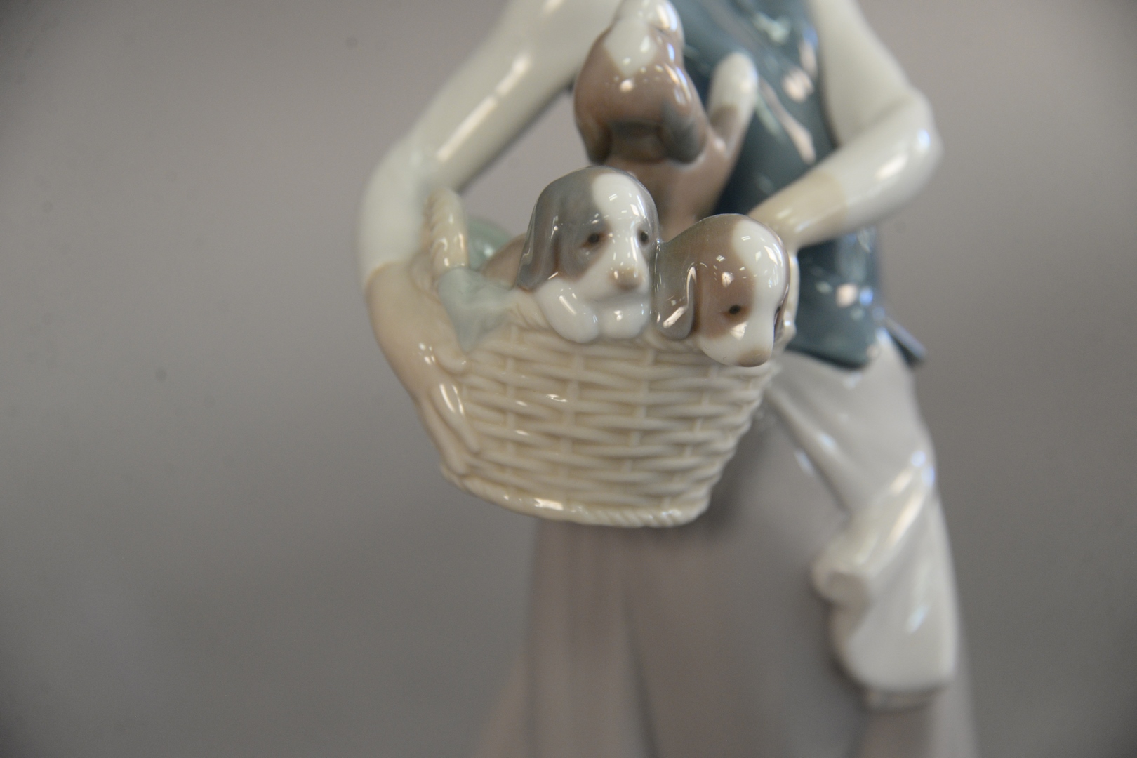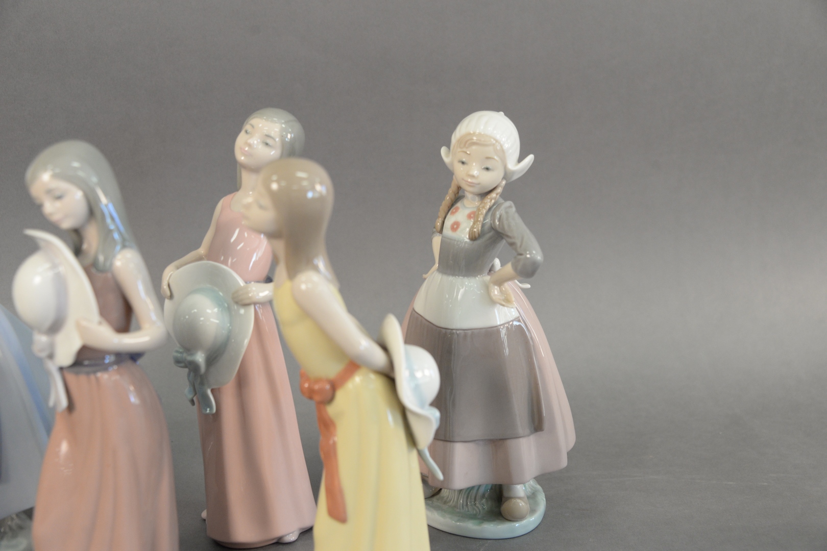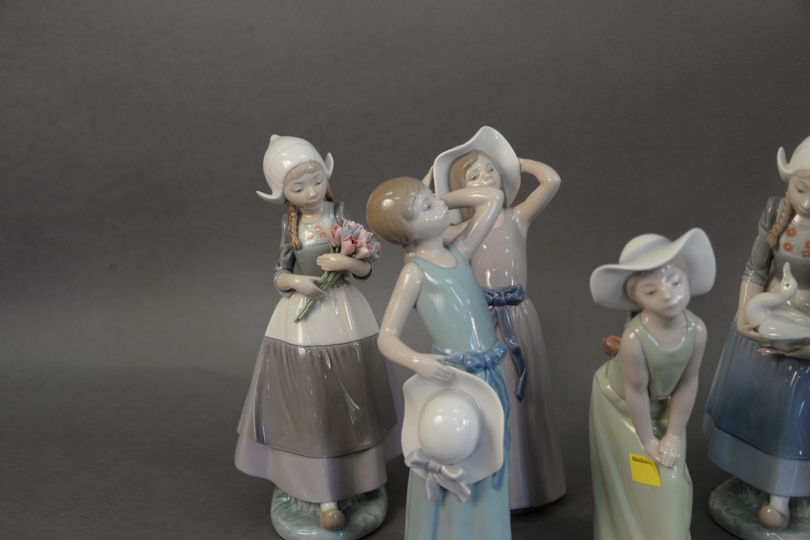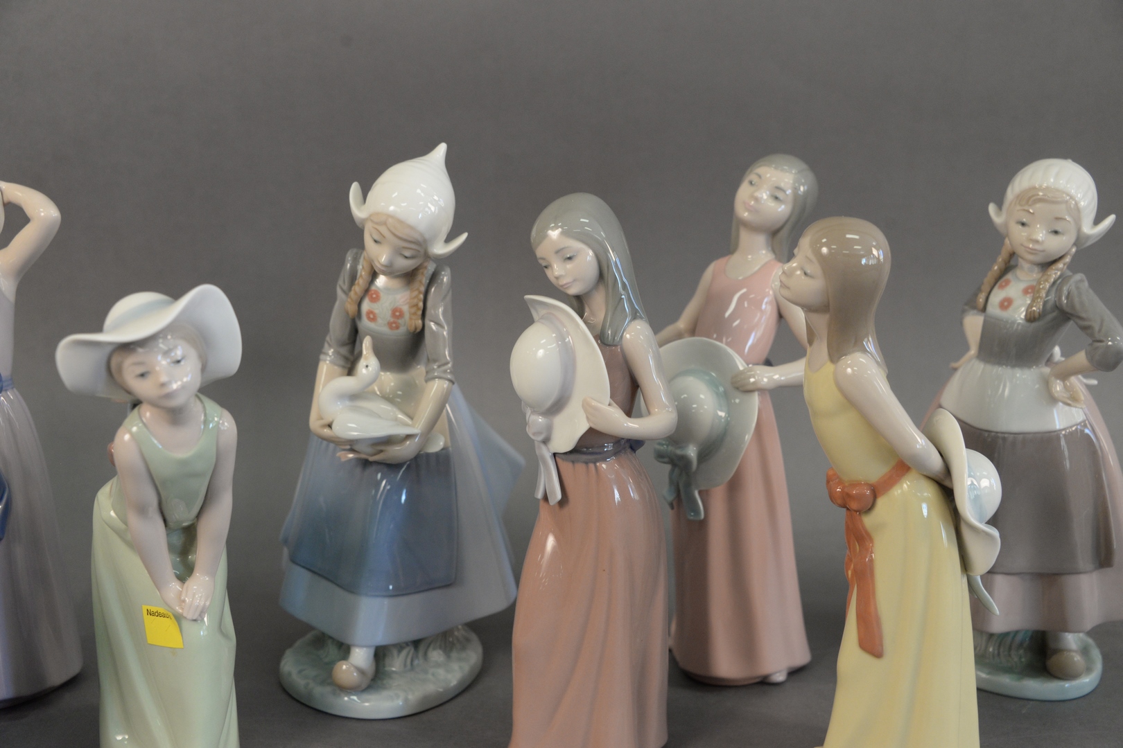 Ten Piece Lot of Lladro Figures, to include girls holding sun hats, one girl having a basket of puppies, one girl holding a duck, along with one with a bouquet of flowers, height of tallest 10 1/4 inches. Provenance: Estate of James Wadhams.