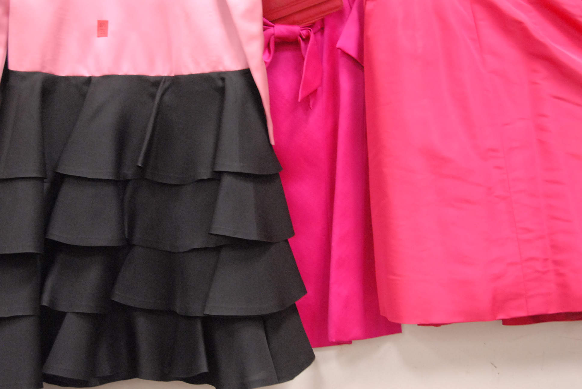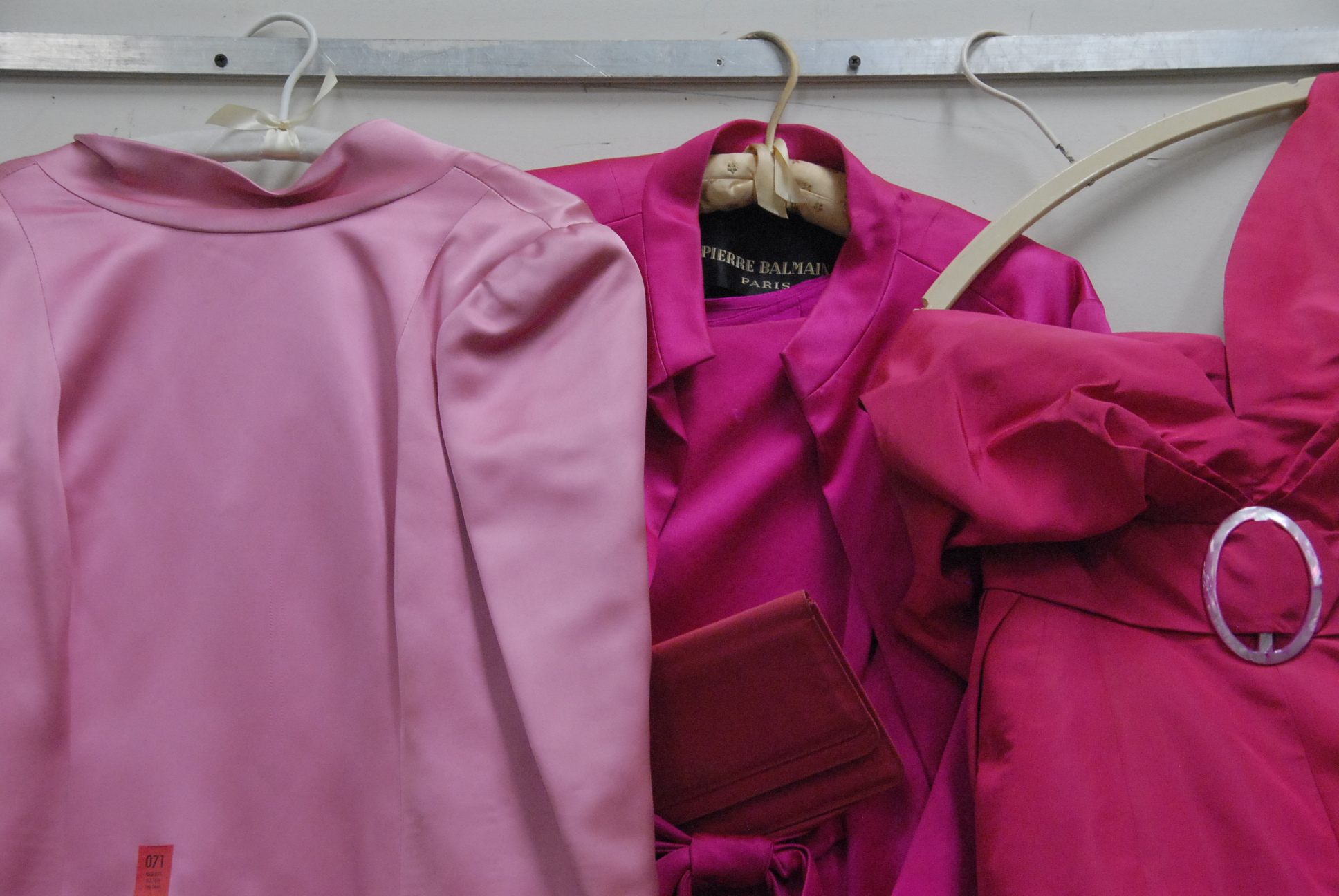 Lot 71: Three Pierre Balmain dresses, each various shades of pink and one having black bottom, one having jacket.