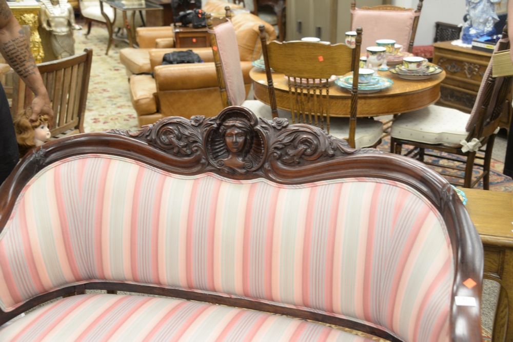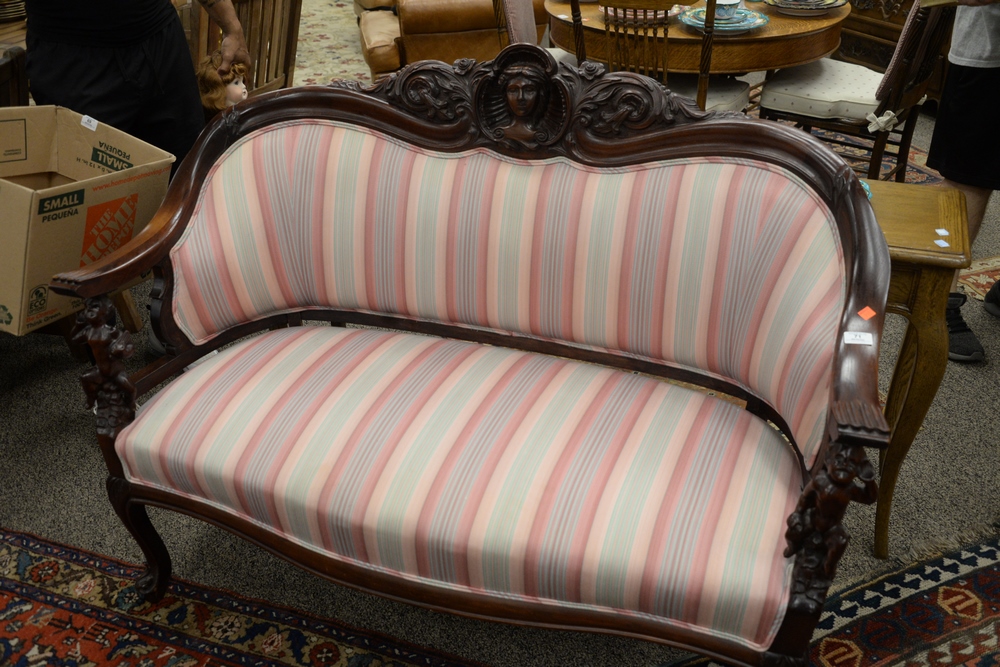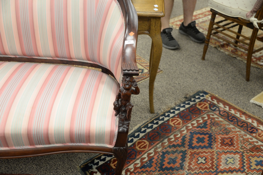 Victorian Loveseat having putti arm supports, height 40 inches, width 52 1/2 inches.