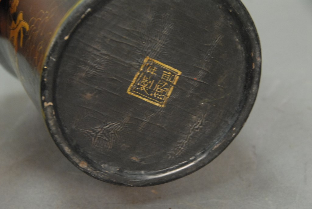 Black lacquered brush pot painted with gilt warrior figures. ht. 7in. dia. 5 1/2in.
