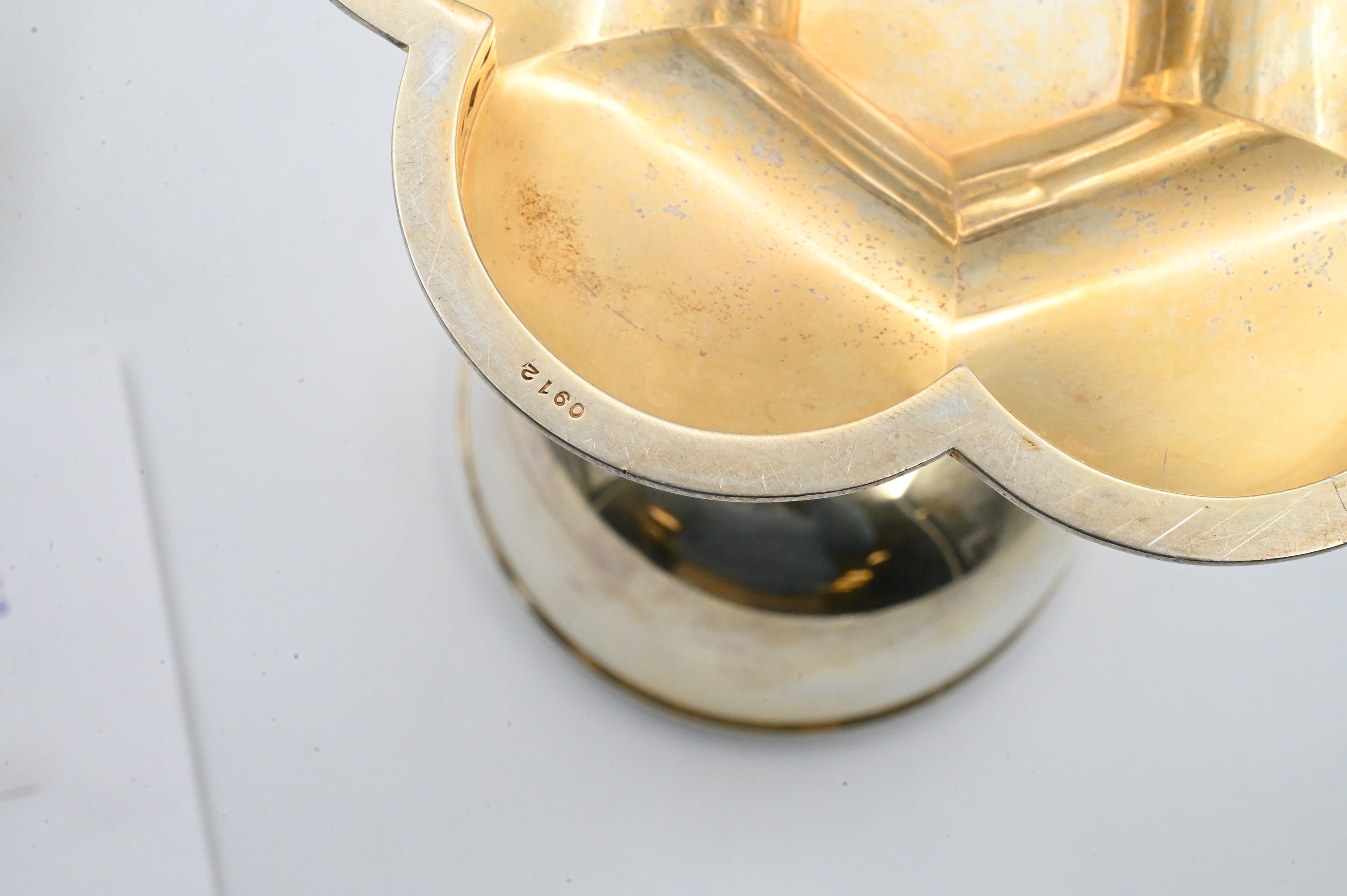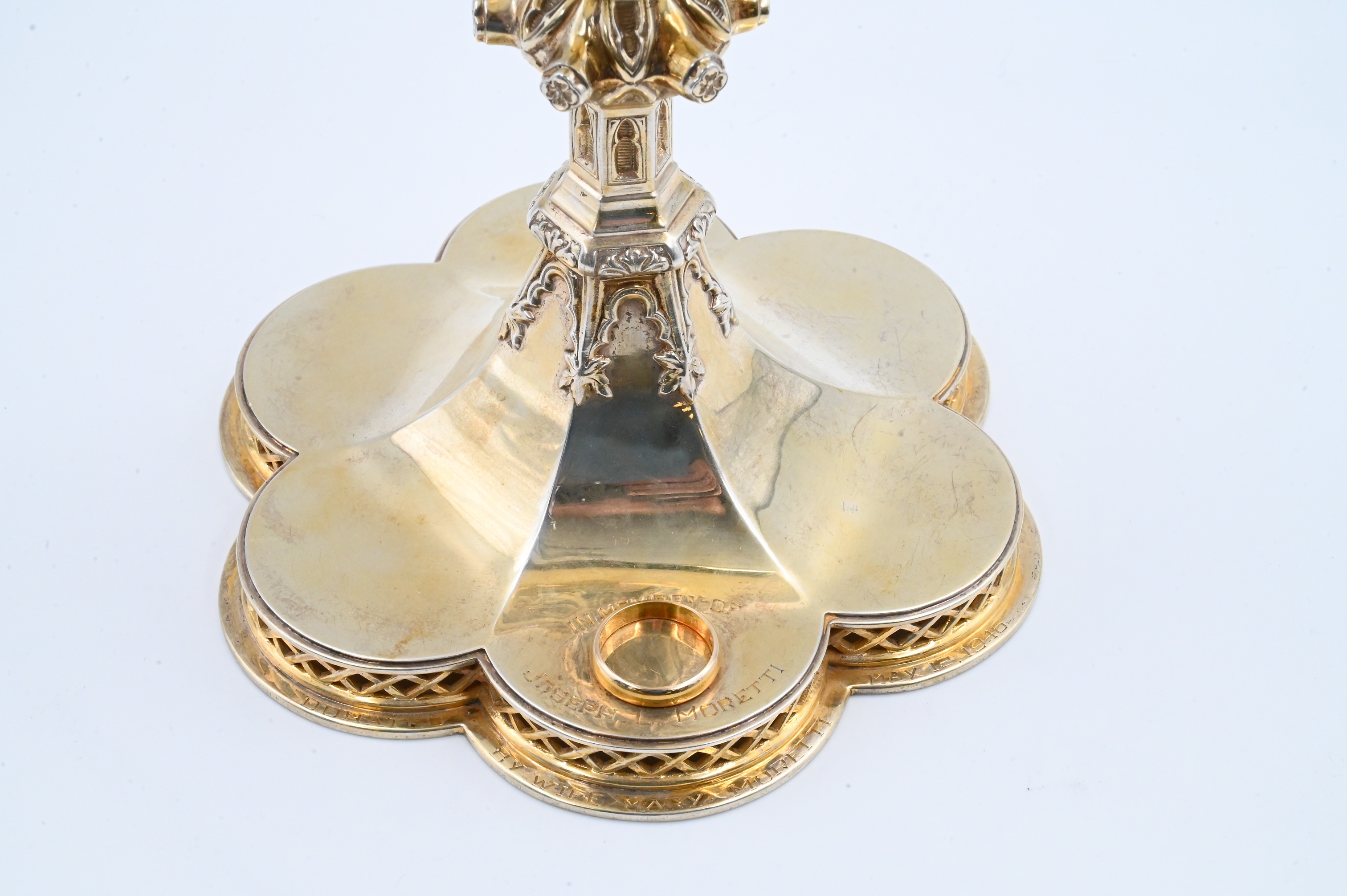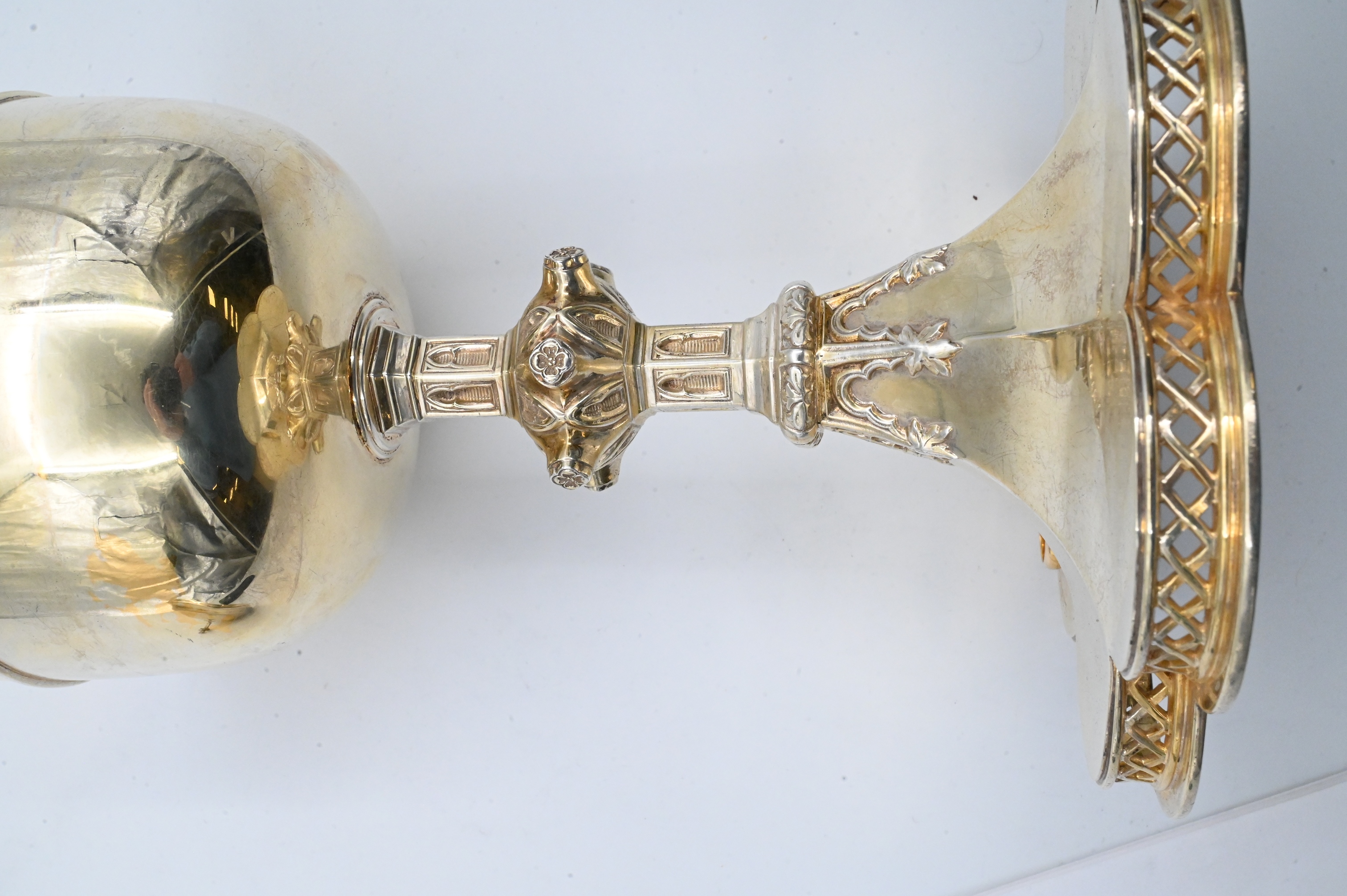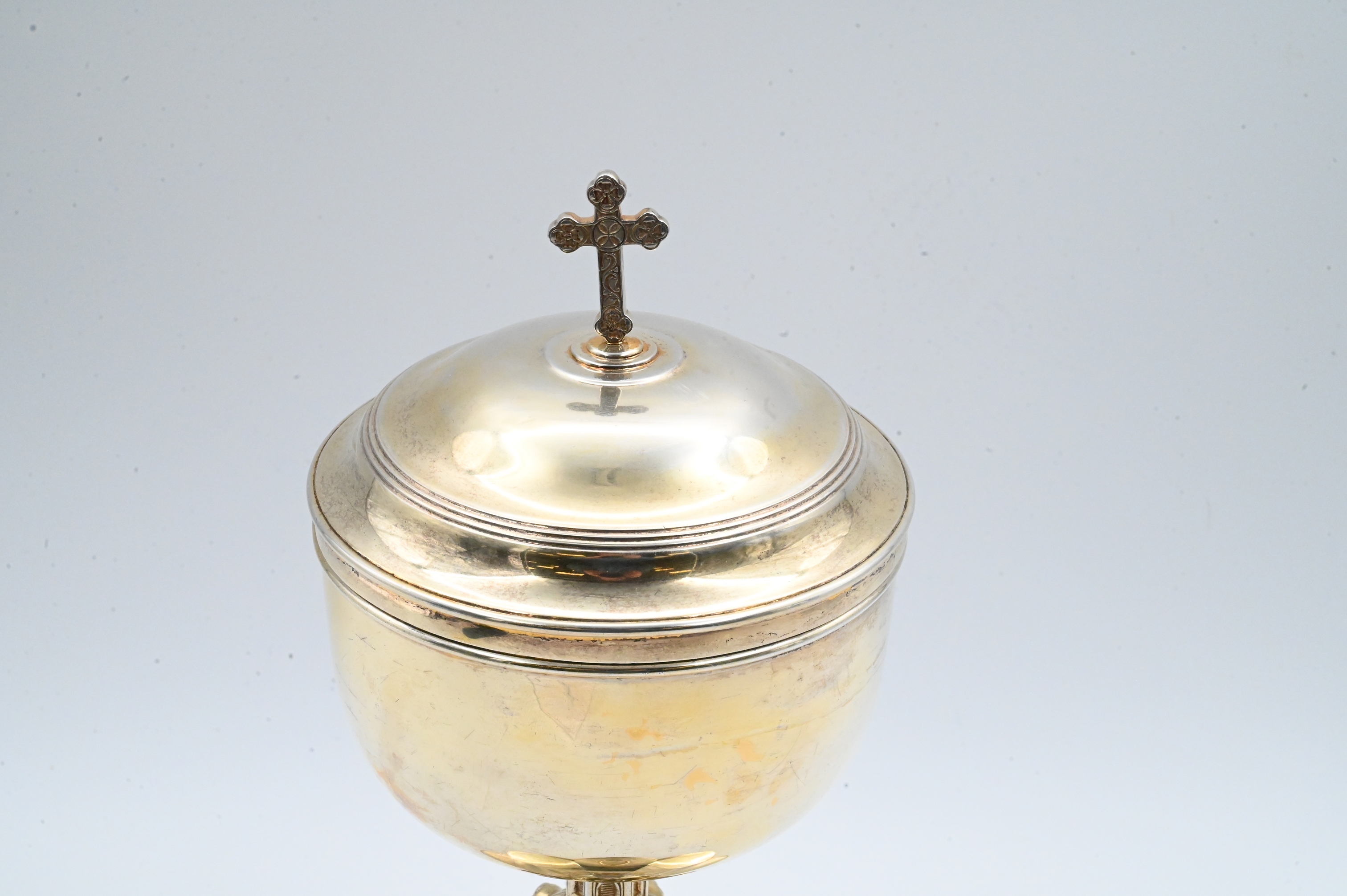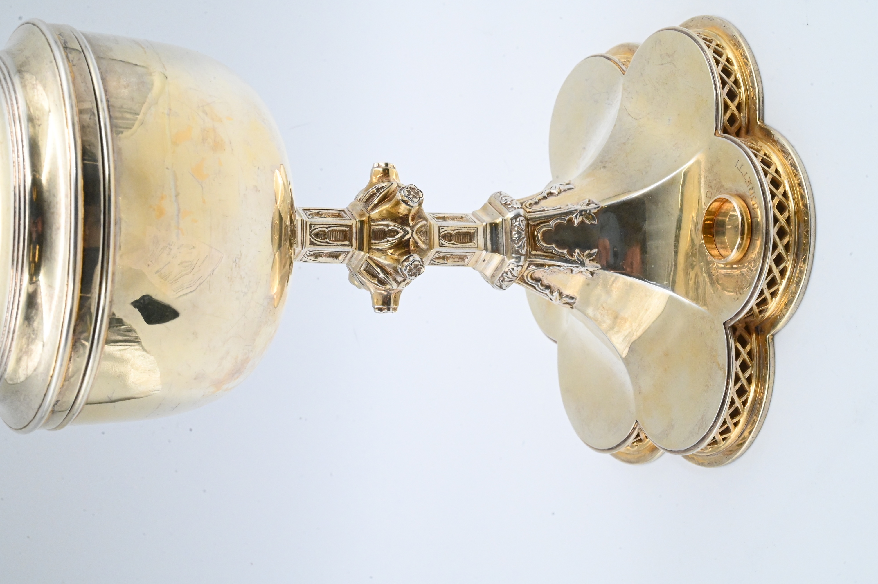 A heavy sterling silver ciborium with gilt interior and a domed lid surmounted by a finely detailed cruciform finial, the cup is smooth and polished, rising above a paneled knopped stem mounted with applied Gothic tracery and cabochon ornaments, the lobed base is decorated with pierced Gothic-style openwork around the perimeter, with additional applied roundel settings Engraving: