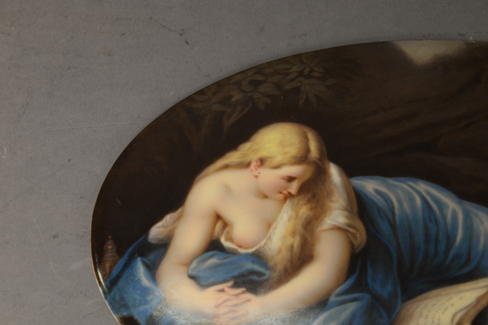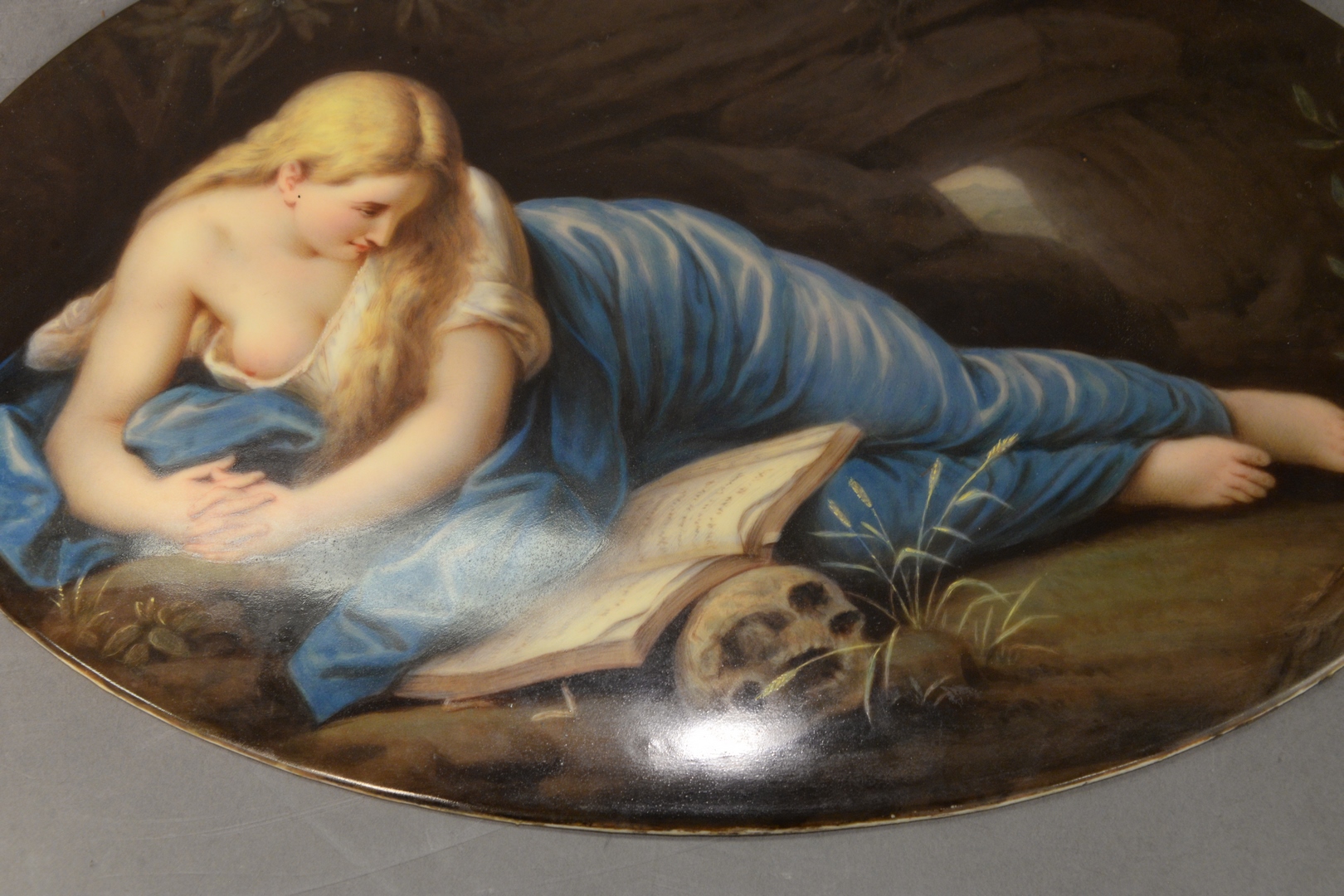 Lot 714: Painted Porcelain Oval Plaque Depicting The Pentient Magdalene, unmarked, height 9 1/2 inches, width 14 inches.