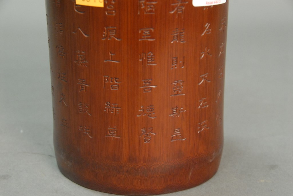 Bamboo brush pot having characters around it. ht. 6in. dia. 5in.
