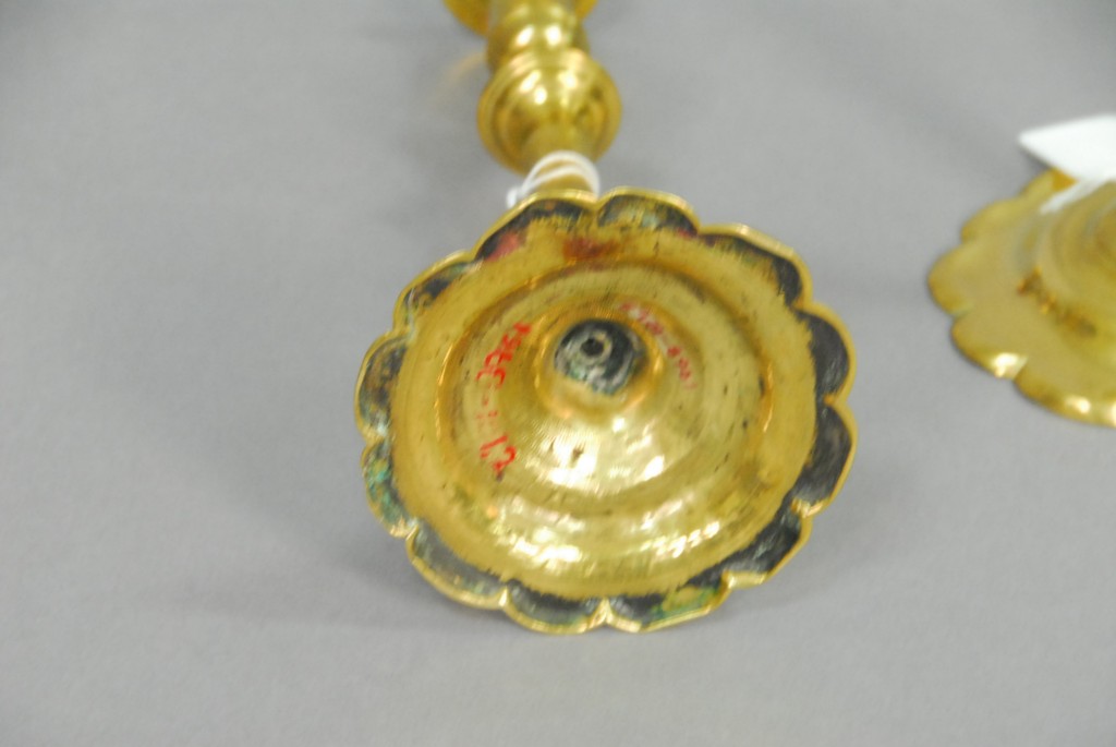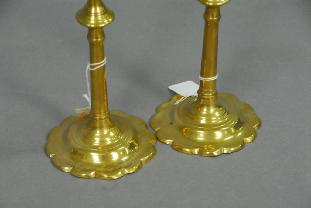 Pair of early brass, petal base candlesticks. – ht. 9in.