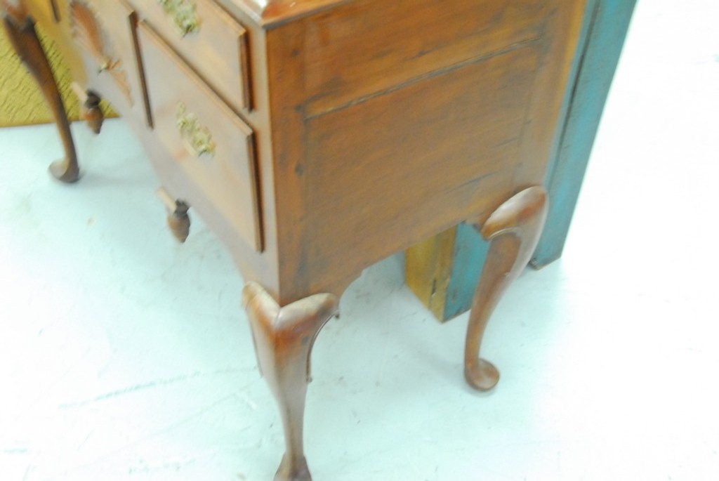 Lot 716: Queen Anne highboy in two parts will full bonnet top on base with fan carving all set on cabriole legs ending in pad feet top made …