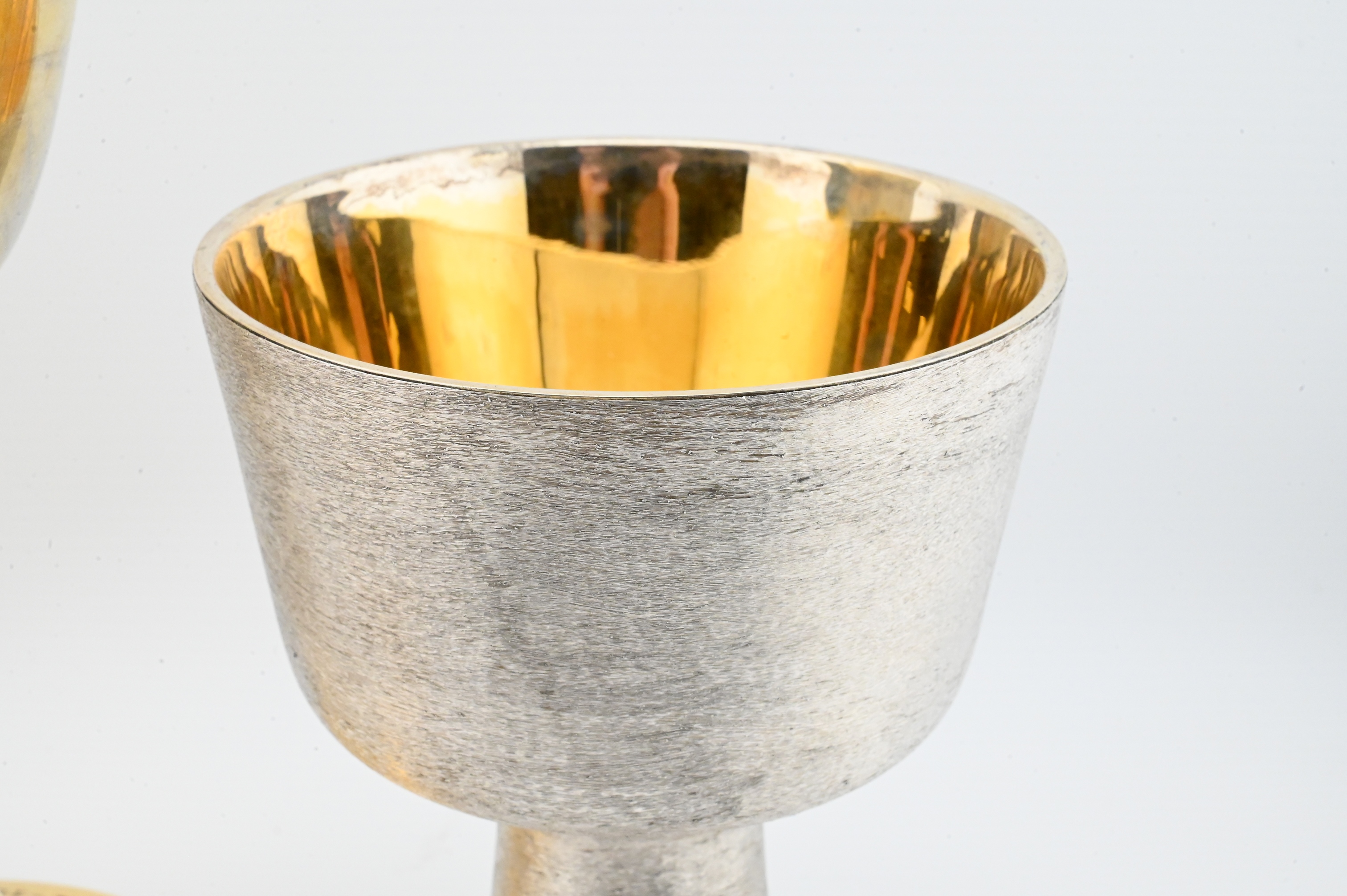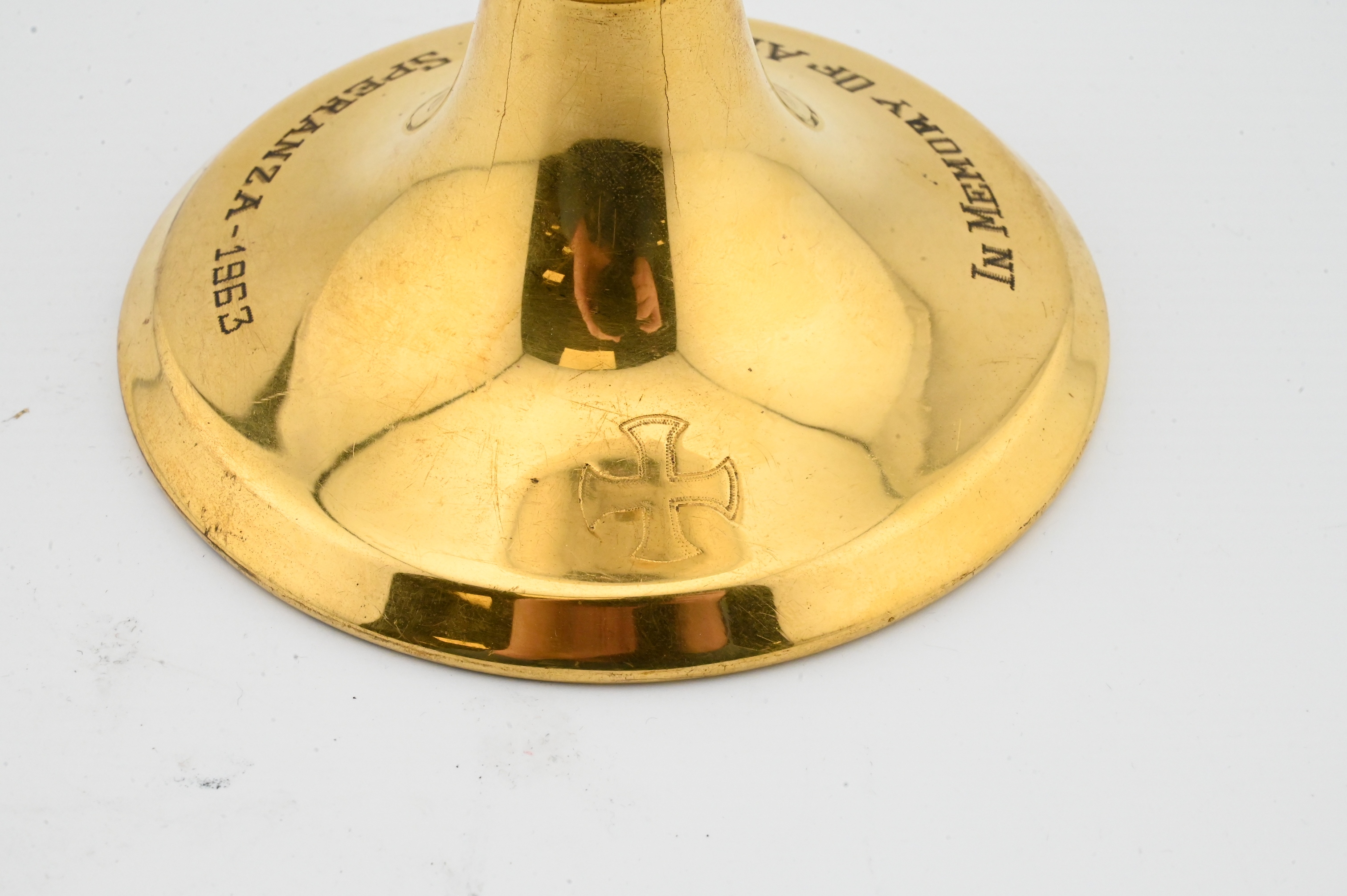the first chalice with a polished, gold-washed sterling silver cup over a gilt metal stem and foot, the octagonal base engraved “In Memory of Anthony T. Speranza – 1963” along with a modern Sterling Silver Spanish Chalice, textured cylindrical bowl on flared stem, the interior fully gilt, underside stamped “Spain” and “SILVER CUP STERLING”