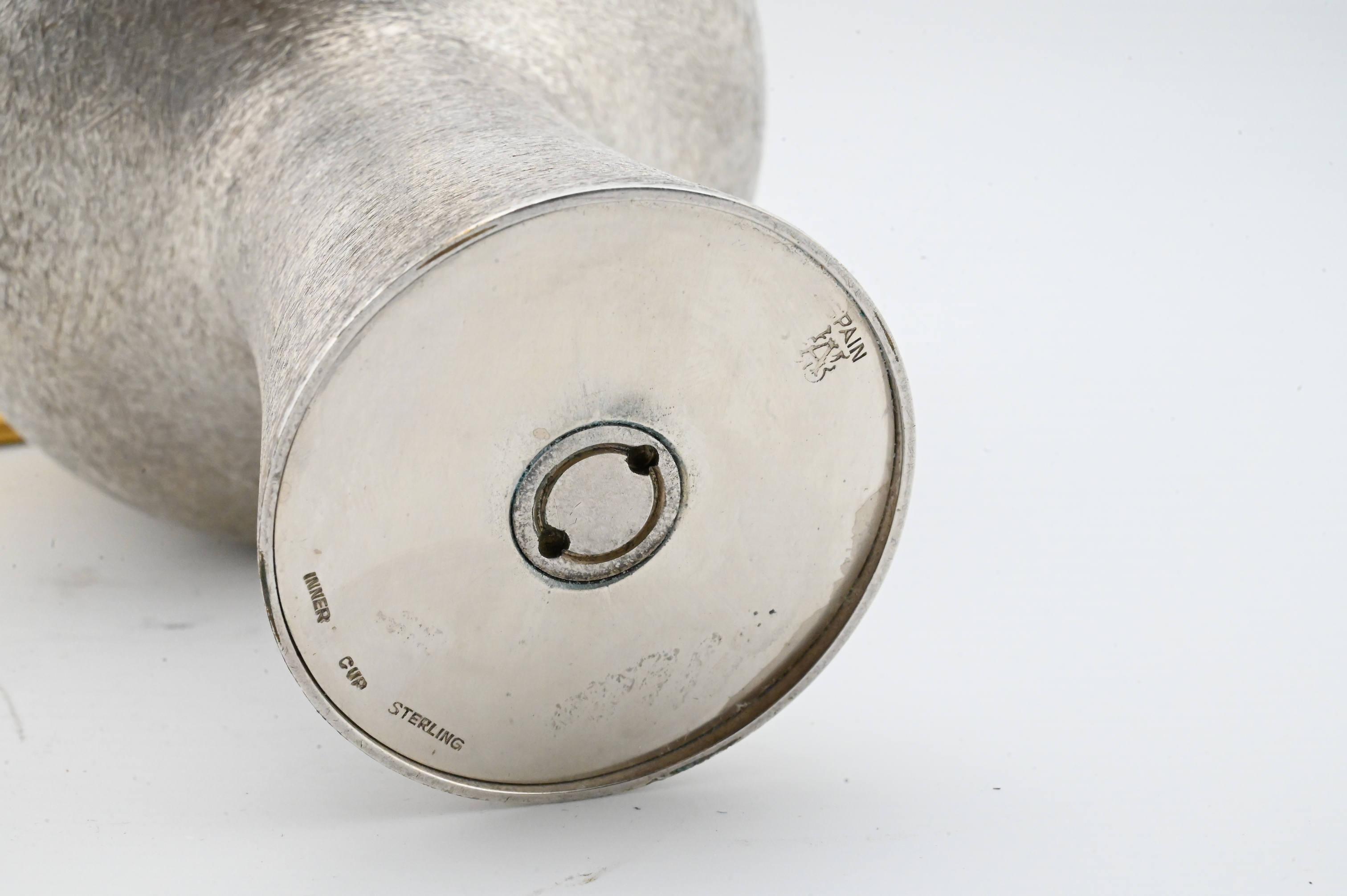 first cup height 7 3/4 inches; overall height 7 3/4 inches, sterling silver cup weight: 4.9 troy ounces, total assembled weight 15.1 troy ounces; second height: 5 3/4 inches Total weight: 18.9 troy ounces