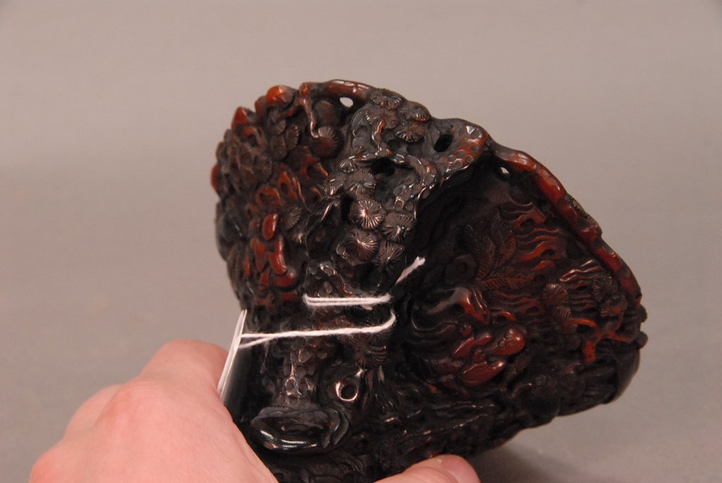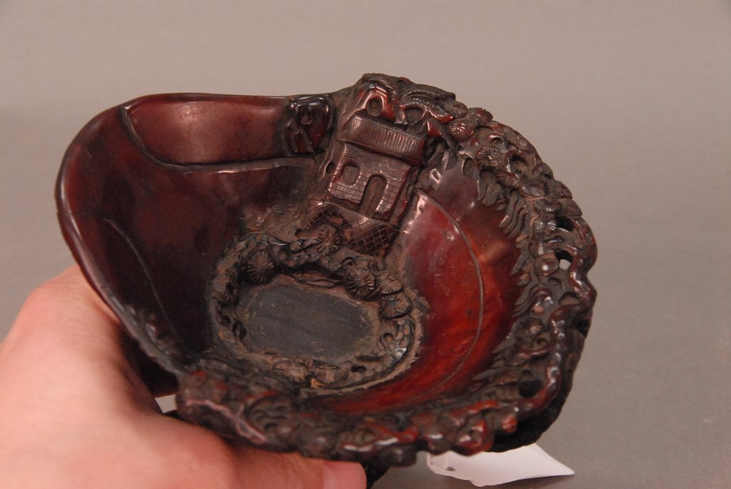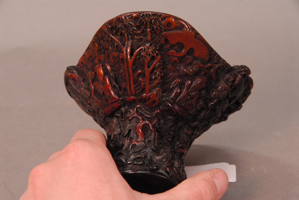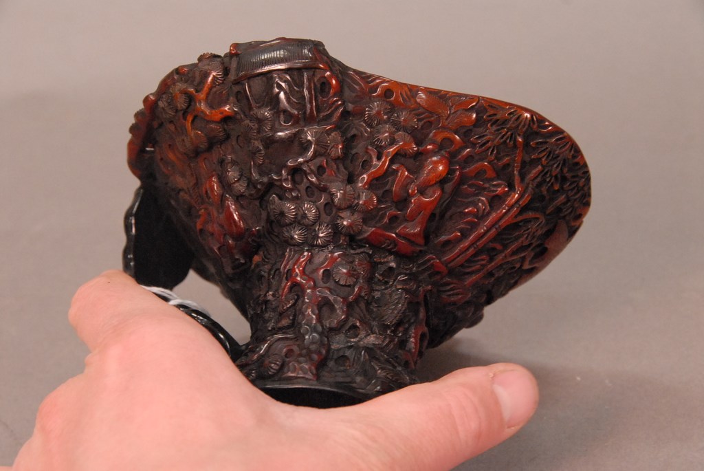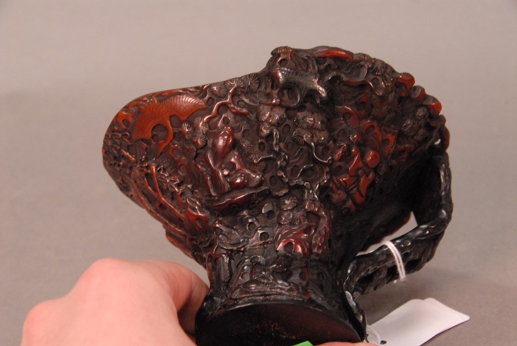 Lot 719: Chinese intricately carved horn handled cup. ht. 4 1/4in.