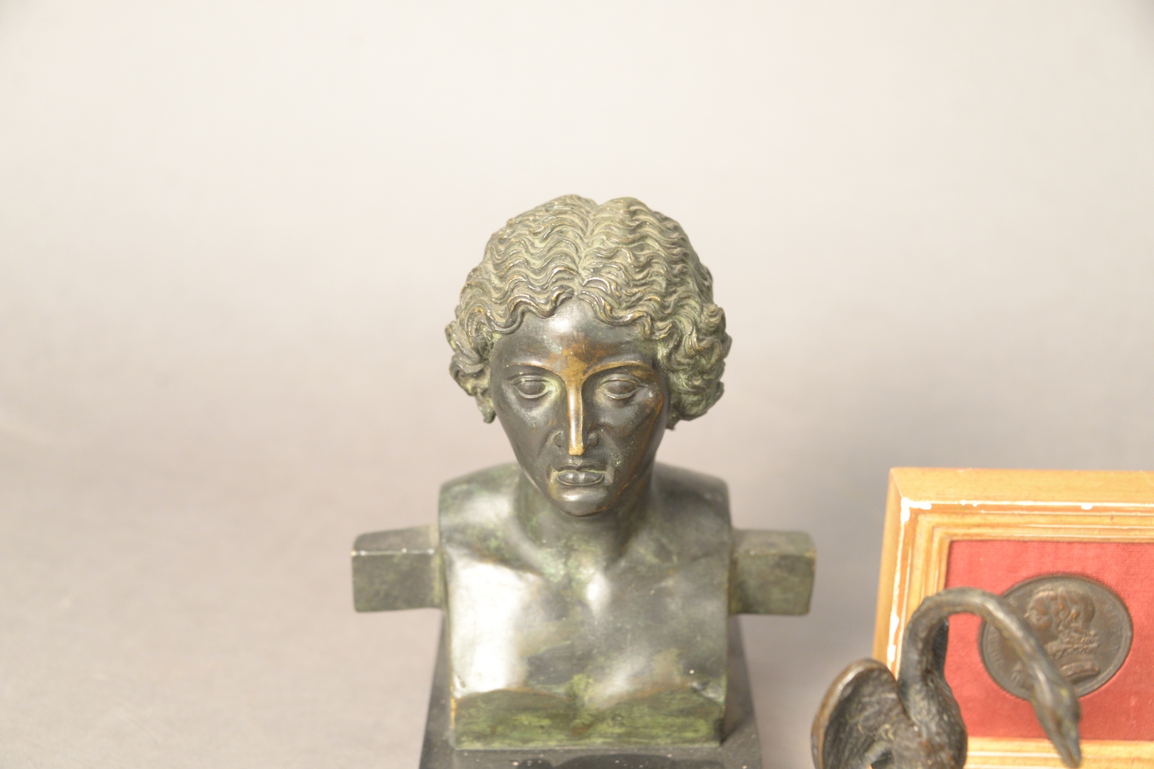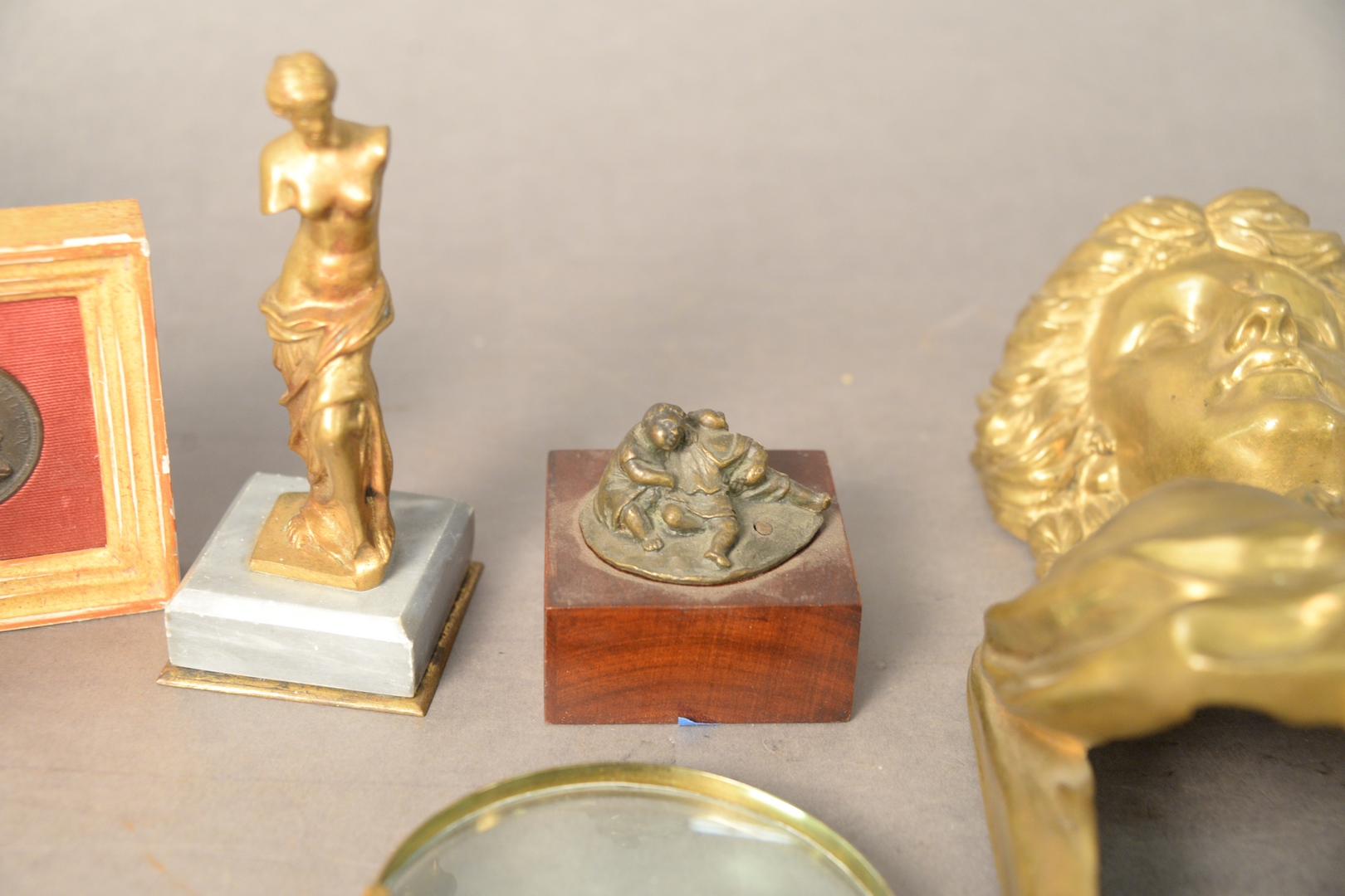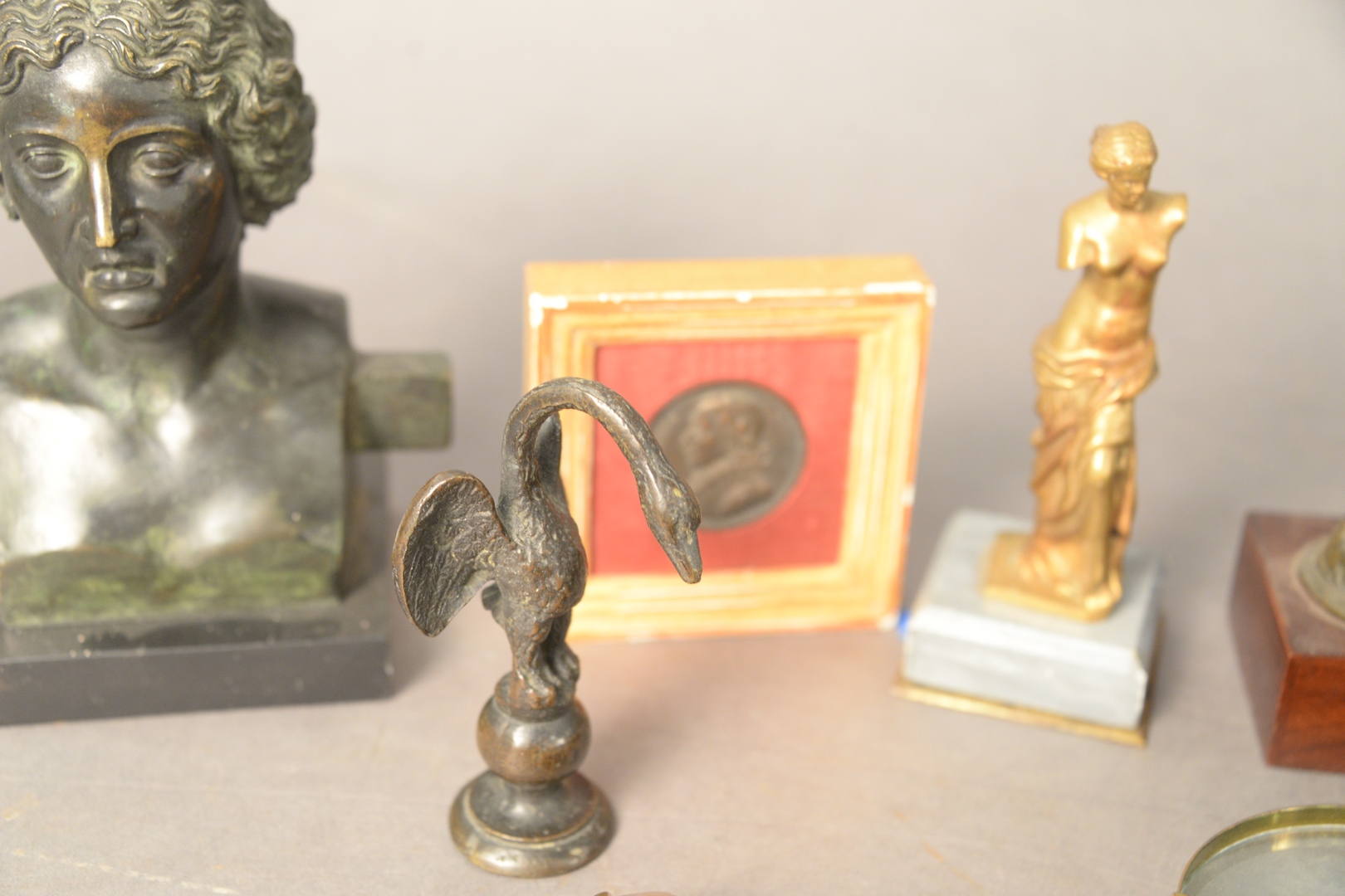 Seven Piece Lot of Grand Tour Items, to include two busts, a brass magnifying glass, brass reproduction of the Venus de Milo, small bronze of babies, bronze of a swan, along with a framed Johannes Milton coin.