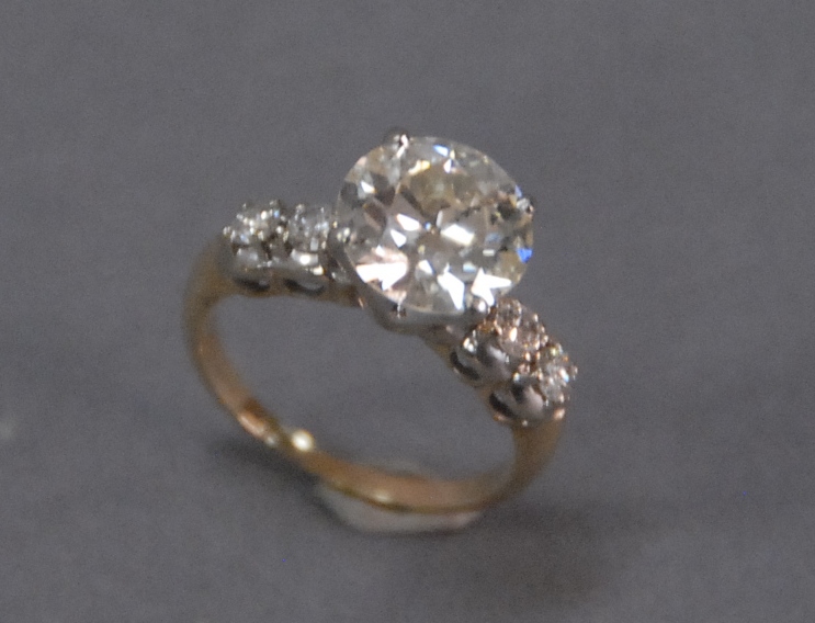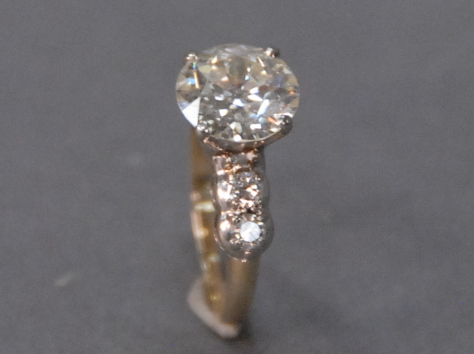 Lot 71A: 14K diamond engagement ring having one round brilliant cut diamond in the center measuring 9.2 x 9.28 x 5.12mm with approximate carat weight of 2.65 by formula, diamond has L-M color and VS1 clarity, there are two 2 round brilliant cut diamonds on