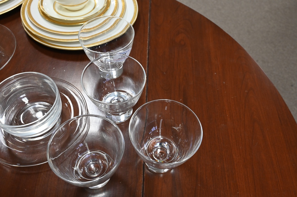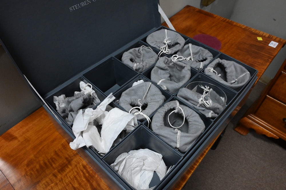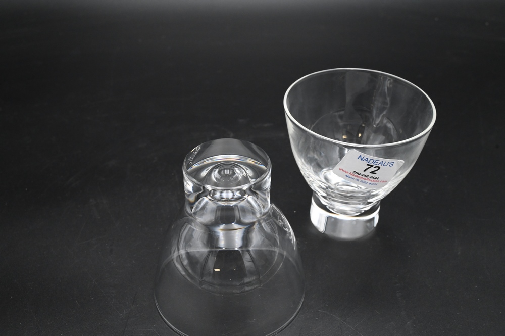 Lot 72: 12 Steuben Crystal Footed Rocks Glasses, along with original box and individual cloth bags, height 4 inches.