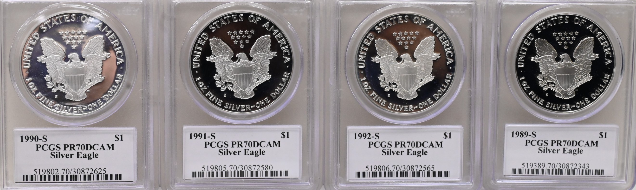 4 PCGS Deep Cameo MS 70 proof Silver Eagles, 1989-S, 1990-S, 1991-S, and 1992-S.