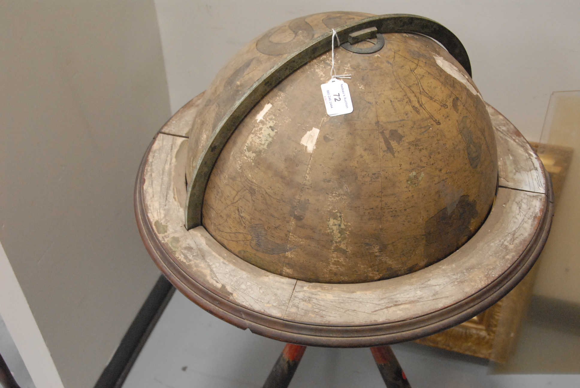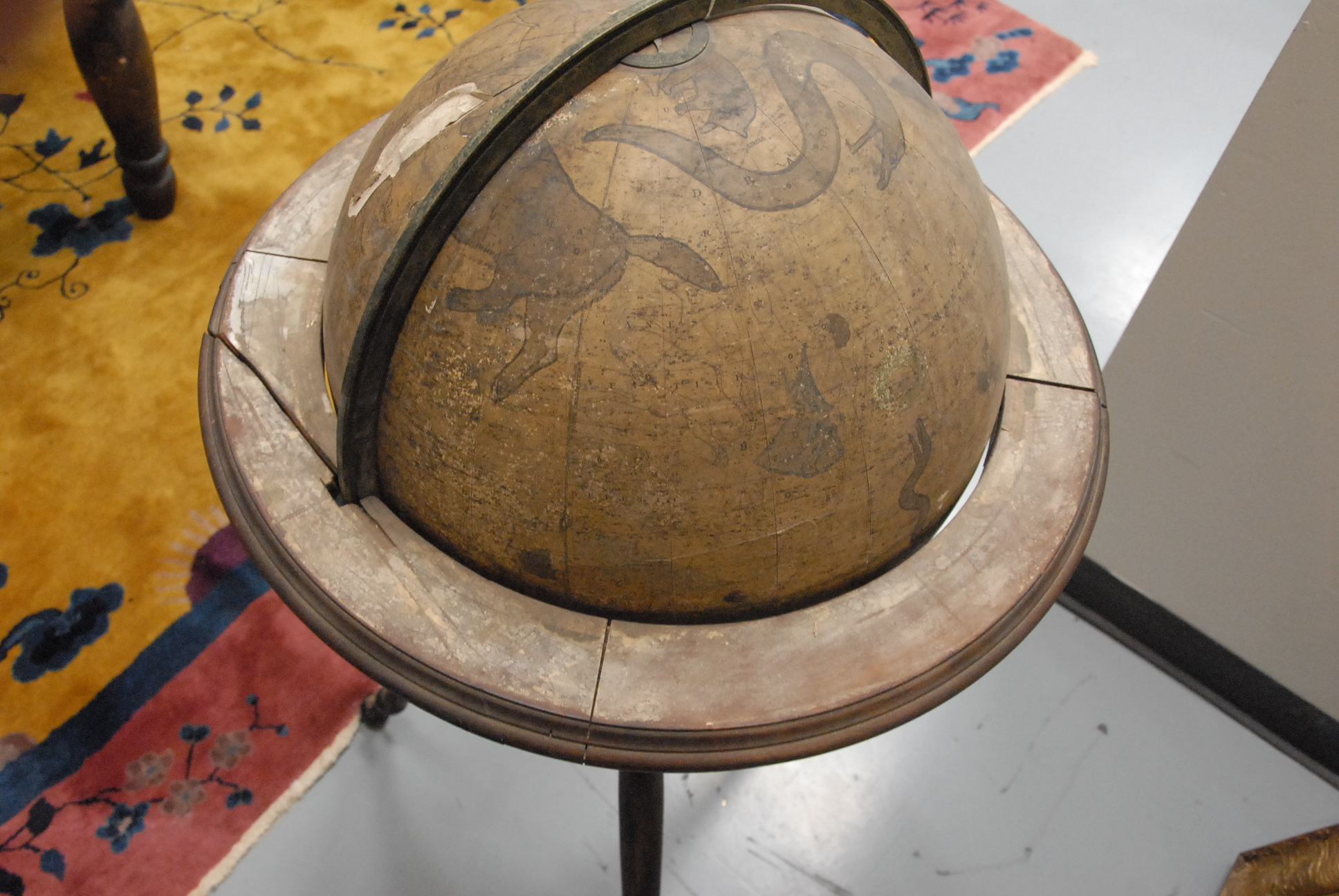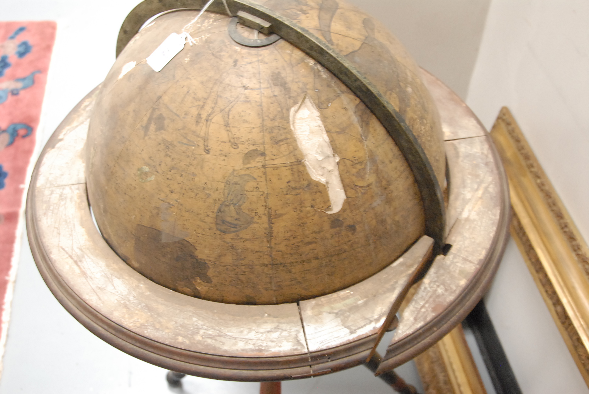 Celestial globe on tripod base painted black and red with gold decoration, as is.