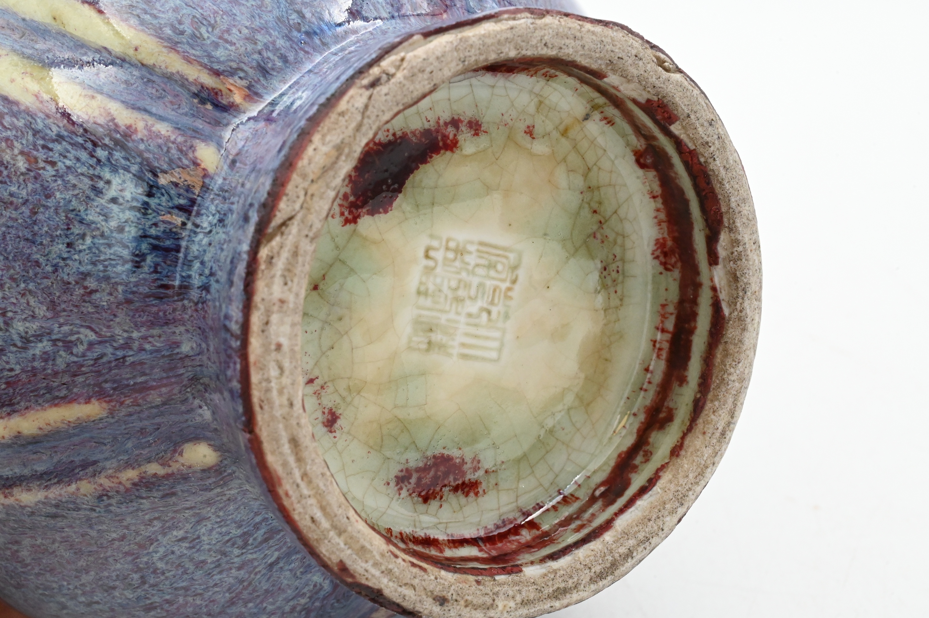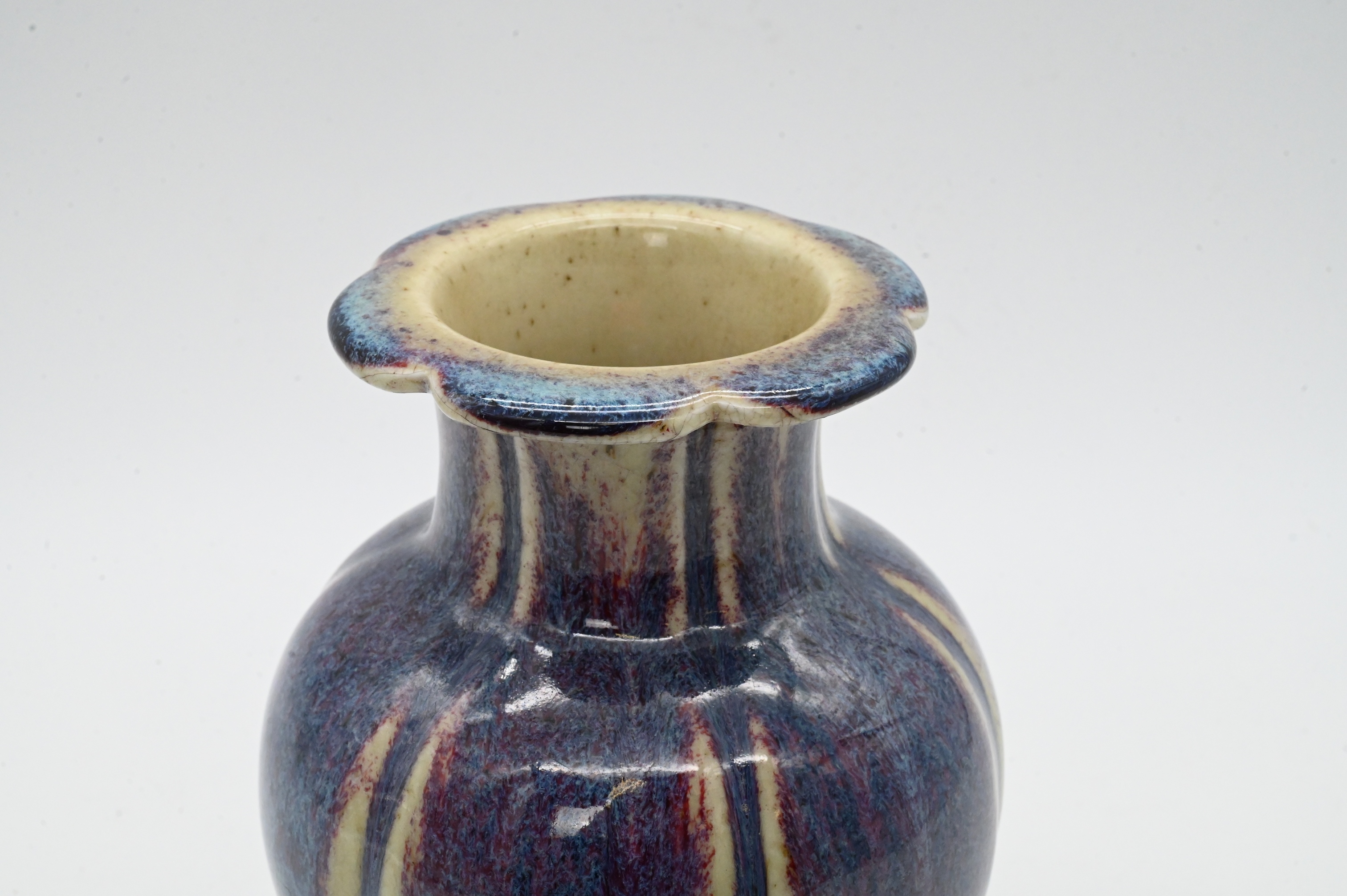 A porcelain vase of bulbous form with flaring rim, covered overall in a flambé glaze of streaked purple and red with vertical cream and lavender striations.