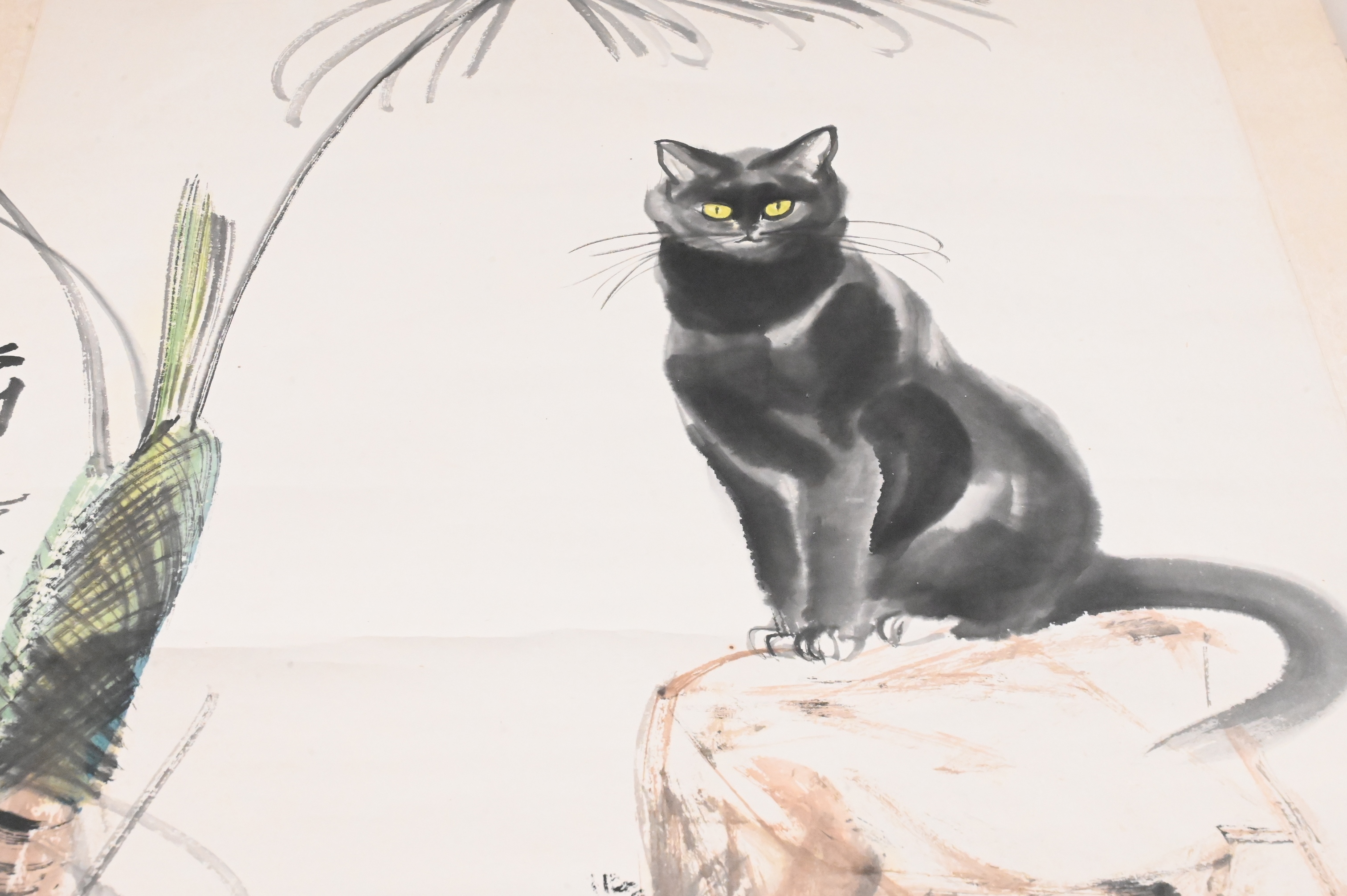 A hanging scroll painting depicting a black cat perched on a rock beneath leafy branches, rendered in ink and color on paper, with artist’s inscription and red seals. Mounted on a cream silk border. Christie’s label verso